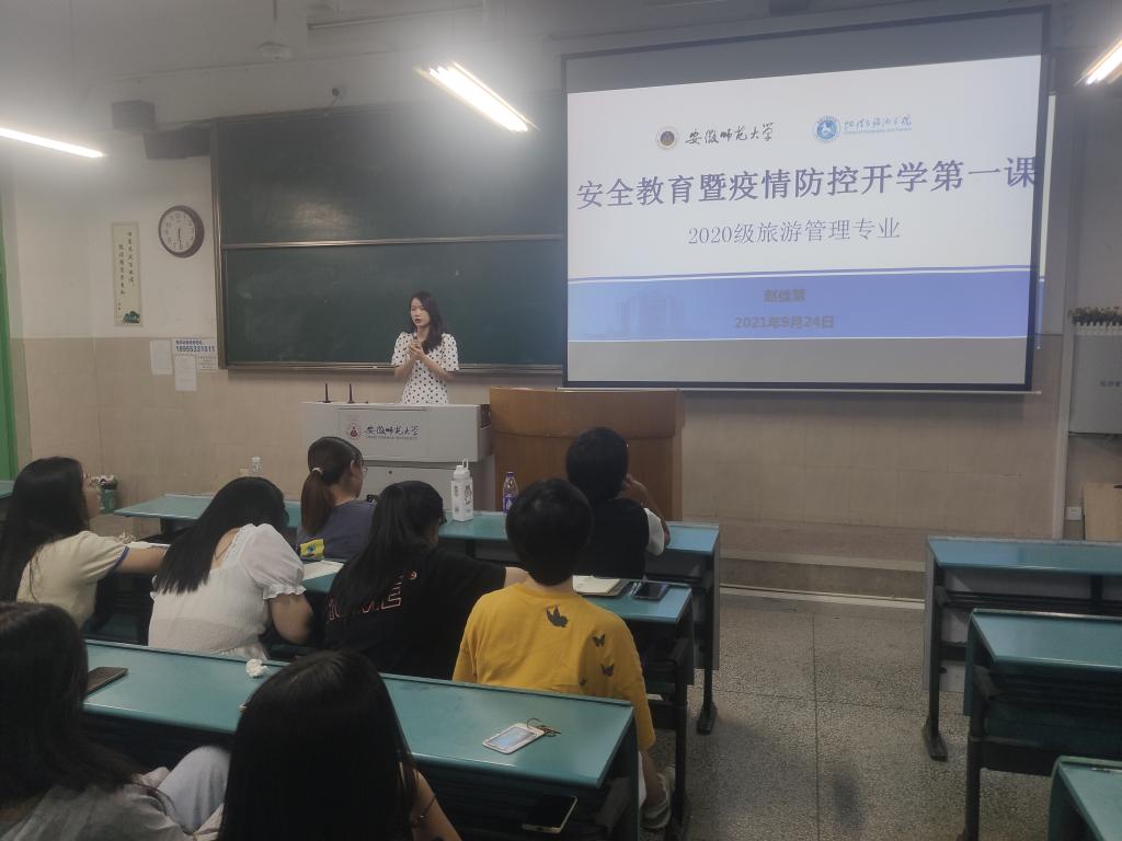 赵佳慧 舒玉茹)疫情防控常态化,安全教育不松手。为积极响应学校关于加强学生安全教育的号召,加强学生安全意识,同时结合疫情防控常态化背景下提醒同学们重视疫情防控工作,营造良好学习生活环境,为新学期在校的学习生活保驾护航。2020级旅游管理专业于9月24日晚在行知楼2号楼103教室召开主题班会。班会由辅导员赵佳慧老师主持,2020级旅游管理全体同学参加。