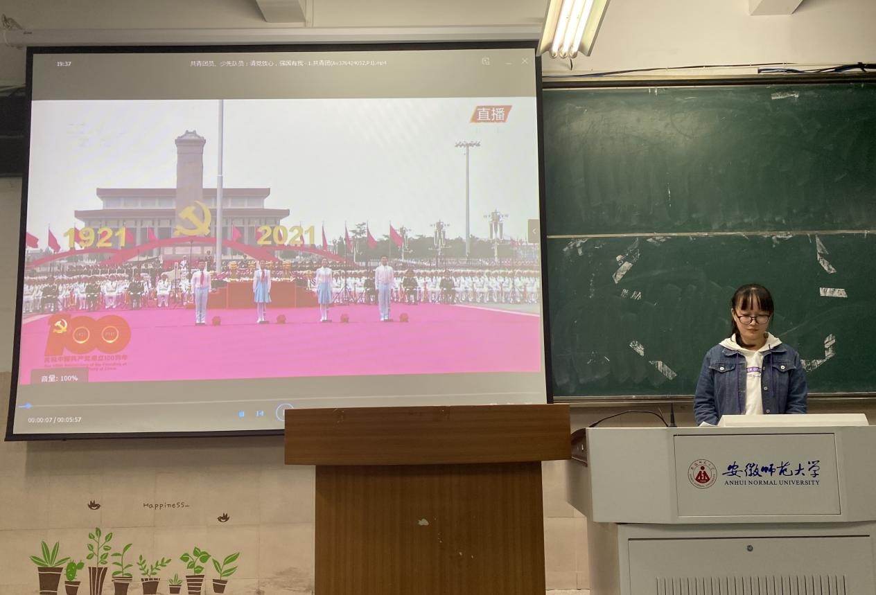 徐嘉祺带领大家共同观看共青团员和少先队员代表在庆祝中国共产党成立100周年大会上的集体献词。在激昂澎湃的致辞中,大家感受到了中国新一代青年青春热血的力量和党对青年一代勇担重任、努力奋斗推进中华民族伟大复兴事业的殷切期盼。