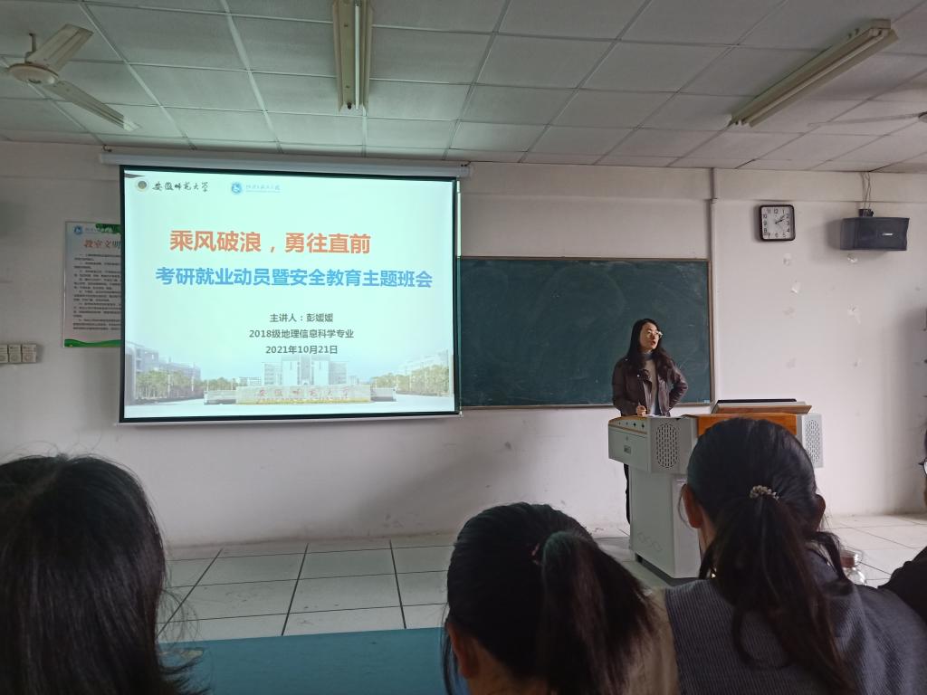 实验楼201开展考研就业动员暨安全教育主题班会,会议由辅导员彭媛媛主持,2018级地理信息科学专业全体学生参与。