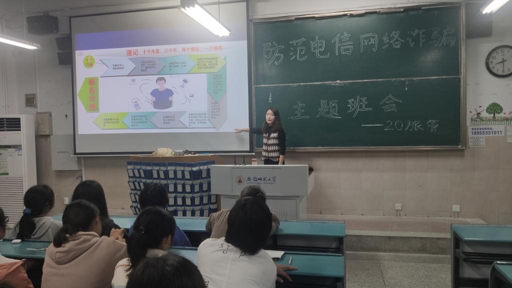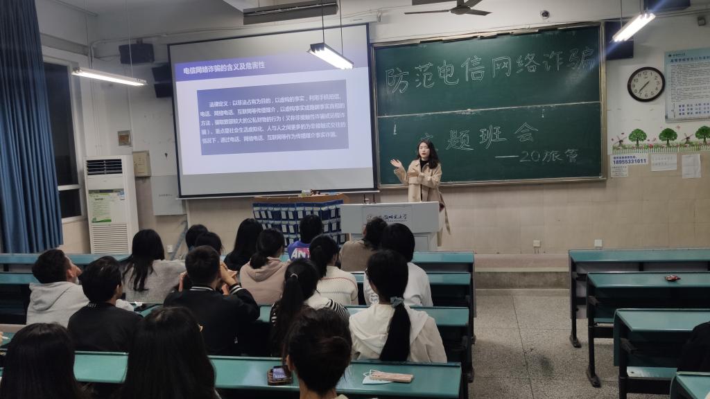 班会伊始,赵佳慧先是向同学们阐明此次召开防范电信网络诈骗主题班会的意义,电信网络诈骗案件中受骗人员中高校学生比例已超10%,希望通过主题班会能够切实增强同学们的防范意识,普及相关知识,减少此类事件的发生。紧接着,赵佳慧介绍了电信网络诈骗的各种新形式新特点,并根据不同诈骗名称形式介绍了相关真实案例:如“杀猪盘式”诈骗即为利用社交婚恋平台等先和被害人建立联系再进行诈骗等。以案说法,以案警示。通过生动的案例分析,图片展示,让同学们了解了电信网路诈骗的不同形式,对网络电信诈骗的认识也更加深刻。随后赵佳慧带领大家学习该如何防范各式网络电信诈骗,最根本方法是提高防范意识,从源头切断,不给诈骗犯机会,若发现已经陷入了圈套里需要立即向老师以及有关部门求助,尽可能减少损失,保护好自己的生命和财产安全。班会的最后,赵佳慧再次跟学生强调近期多个城市疫情形势严峻,除要严格落实 “晨午晚”检制度外,依旧要坚持“非必要不外出”原则,严格遵守外出请假制度,不得擅自离校、晚归不归,提醒同学们要对自己和他人的生命安全负责。同时要重视每周的查寝制度,做好寝室安全卫生相关工作。切勿抱有侥幸心理,生活中遵守制度,学习上力争上游。