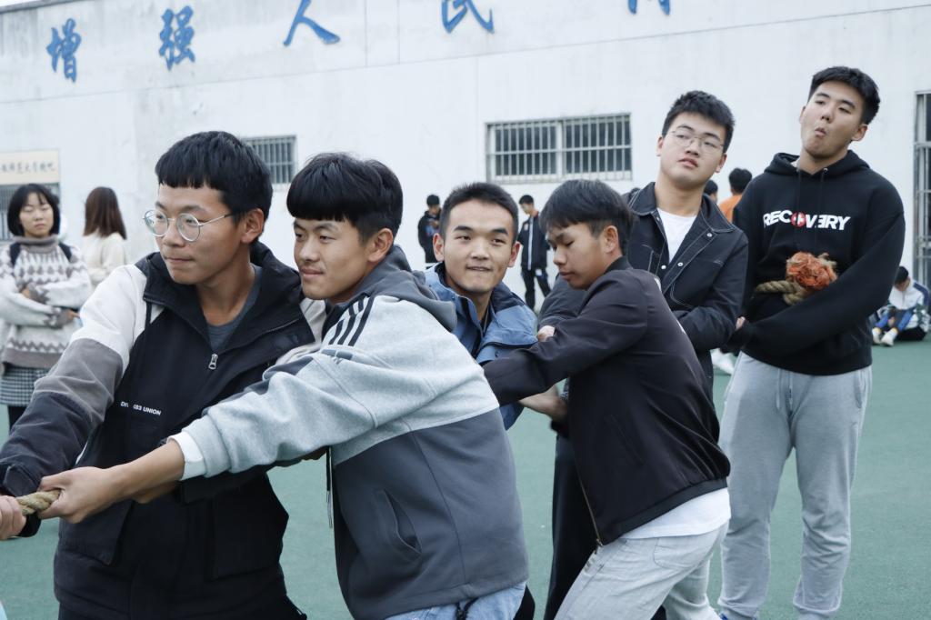 拔河友谊赛。篮球对抗赛之后,旅游管理专业1班和2班又相约南操场进行拔河比赛。两个班的同学在麻绳两端列队,紧张地等待着开始的号令。哨音吹响,两边都攥紧了绳,拼命拉扯着,眼神紧盯着绳中间的红绳,仿佛要用目光将它拉向己方。三轮过后,1班以2:1取得了胜利,但两个班的同学们都欢呼大笑,并与教官一起合影留念。