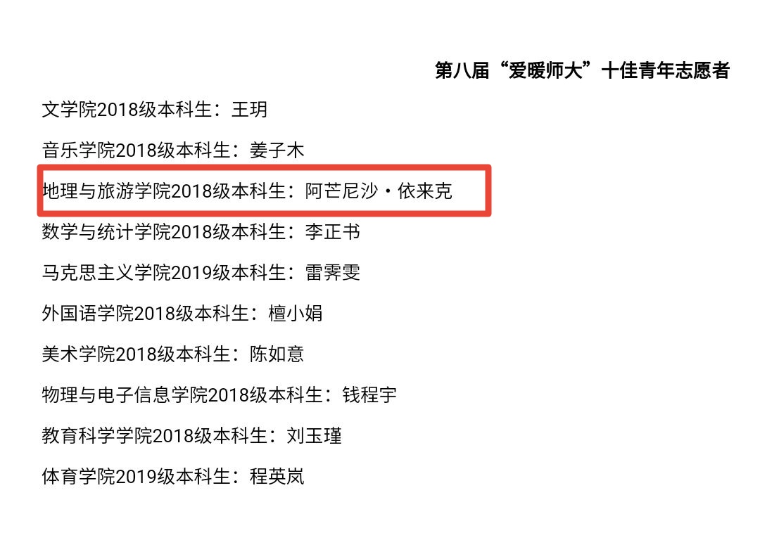 2018级地理科学(师范)专业青年志愿者阿芒尼沙·依来克荣获校十佳青年志愿者。