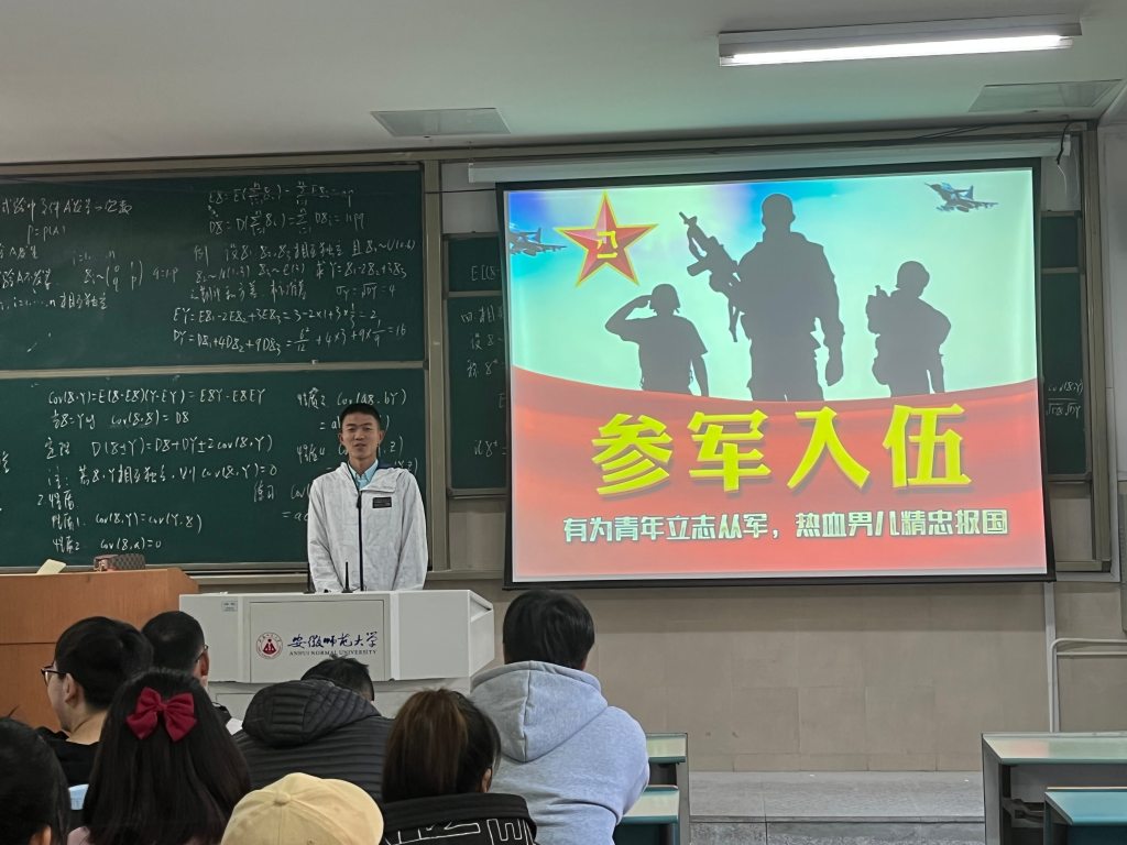 会议第三项:2022届毕业生参军入伍主题班会。彭媛媛向同学们介绍了专项硕士研究生招生计划、考研加分政策、公务员、事业单位定向招录、法干警招录、退役就业服务、国家资助与优待政策、服役发展途径等相关政策,鼓励同学们应征入伍。随后李光早进行部队经历分享,他向同学们介绍了自己在军队中印象最深刻的事情,并详细介绍了有关军队政策,加深同学们对军队的了解。