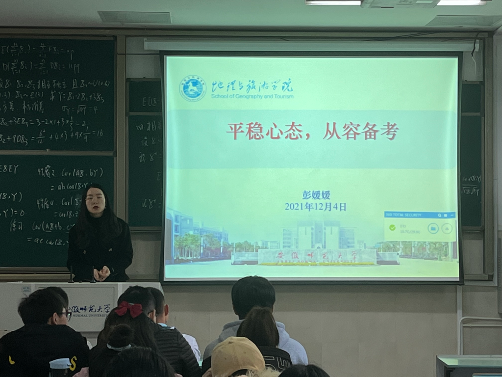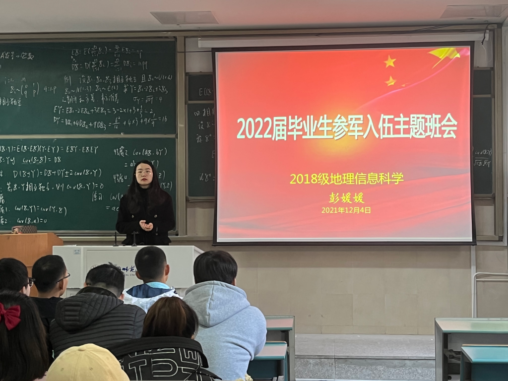 本网讯(孙雯杰 彭媛媛)为提高同学们寝室安全意识,树立正确考研心态,动员毕业生积极参军入伍,2018级地理信息科学专业于2021年12月4日中午11:00在行政楼2040105开展冬季安全教育、复习迎考暨毕业生参军入伍主题班会,会议由辅导员彭媛媛主持, 2018级地理信息科学专业全体同学参与。