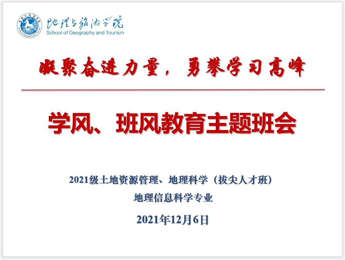马思甜)凝聚奋进力量,勇攀学习高峰。“班风”是一个班级体良好风貌的集中展现,“学风”是提高班级综合素质的关键。为了使新生更好更快地融入集体,构建良好的班集体,12月6日晚辅导员吴文涵带领2021级土地资源管理、2021级地理信息科学及2021级地理科学拔尖人才班开展了以“凝聚奋进力量,勇攀学习高峰”为主题班风学风建设主题班会。