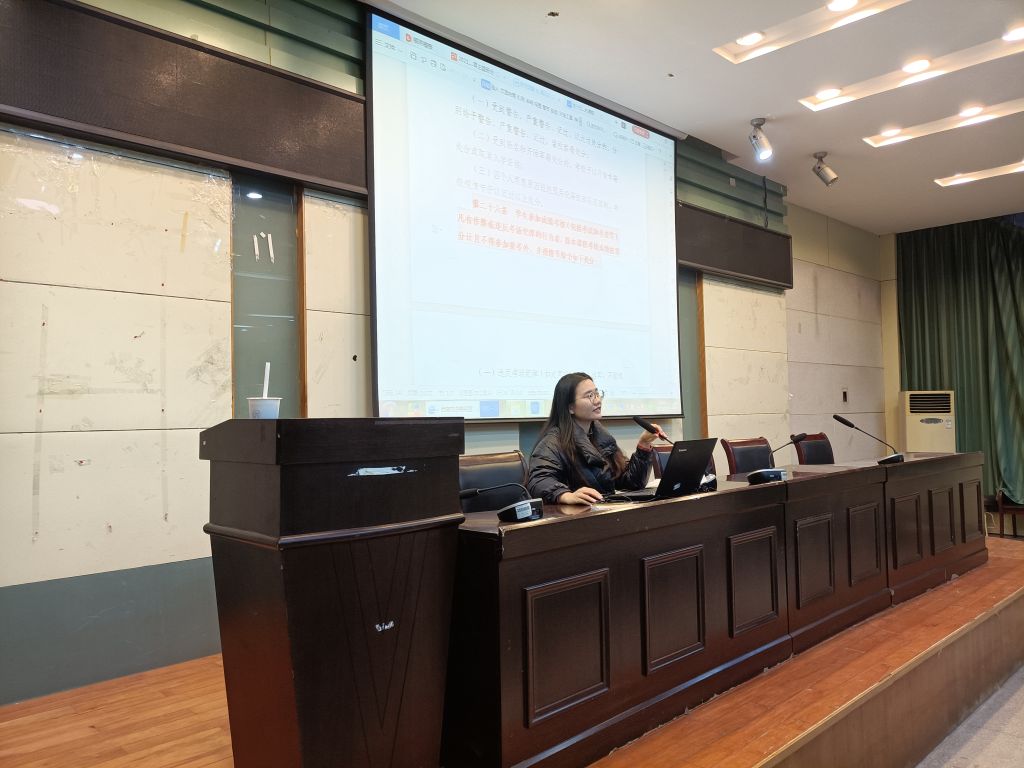 会议伊始,韦银艳向同学们强调学风是学生思想道德品质、学习精神与综合素质的重要体现,是学生成长的基础和前提。大学生应将主要精力集中在学业上,做好学生身份的本职工作,为自身发展、贡献社会、建设国家而学习。然后,针对影响学业的主要原因,韦银艳分别做出了详细的说明。重点介绍了关于“挂科”、“学分不够”、“考试作弊”、“违法违纪”等相关问题,劝诫同学们珍惜大学时光,勤奋学习、刻苦钻研;并且就“考试作弊”行为要求全体同学要诚信考试,切莫因懒惰和侥幸心理而违犯校规校级。