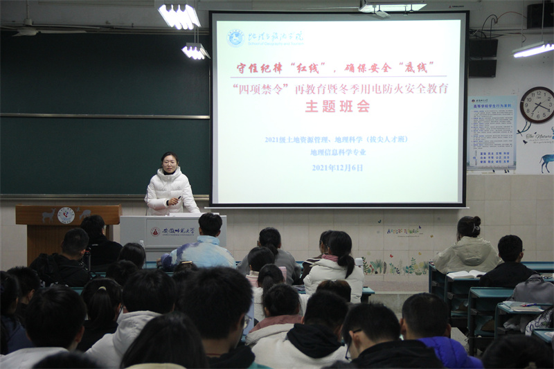 本网讯(地旅学院 曹紫妮 胡珊珊)守住纪律“红线”,确保安全“底线”。冬季是火灾高发季节。为督促学生严格遵守校纪校规,加强防范意识,提升应急能力,2021年12月6日晚上7点30分,2021级地理信息科学、土地资源管理及地理科学拔尖人才班在行知楼4号楼303室召开“守住纪律红线,确保安全底线——四项禁令再教育暨冬季用电防火安全教育”主题班会。本次班会由辅导员吴文涵主持。