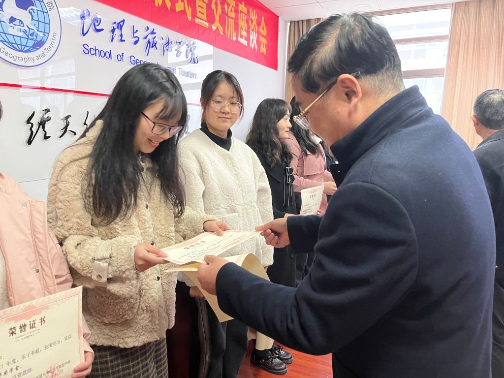 颁发仪式结束后,苏勤代表学院对程伟校友的善举表示感激与赞扬,并对各位获奖同学、实践团队、团支部表示祝贺,希望同学们继续努力学习,保持爱心、善心。随后获奖学生及团队代表上台发言。2018级地理科学(师范)程茜表示自己将继续“潜心修学练就过硬本领,脚踏实地奉献无悔青春”;2020级旅游管理徐雨菲提出自己将坚持“做有理想、有担当的青年人”的理念;2019级地理信息科学黄孙玮彧向同学们展示了其研究课题的精彩汇报;2019级土地资源管理梅笑寒表示自己将继续“夯实基础,严谨负责,完善自我”。