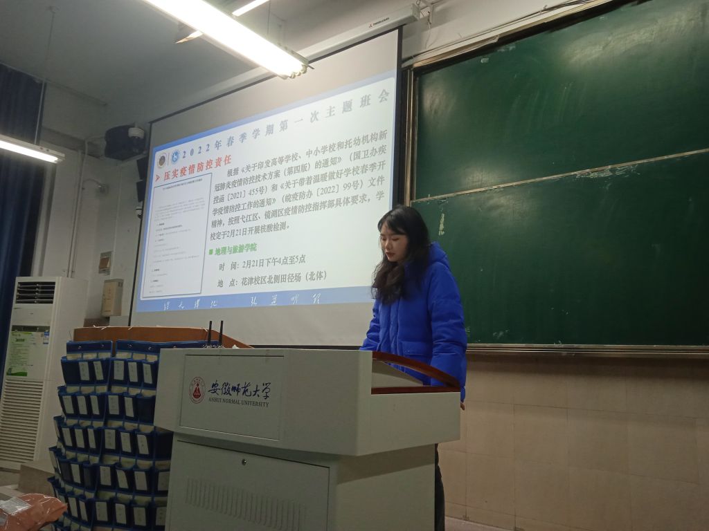 张慧 李娜)为增强学生安全意识,保障学习生活平稳运行,2月20日晚上19点,2018级地理科学(非师范)专业、2018级城乡规划专业2022年春季学期第一次主题班会顺利举行。班会由辅导员张慧主持,会场分为行知楼2号楼104教室和腾讯会议室,2018级地理科学(非师范)专业、2018级城乡规划专业全体同学参加。