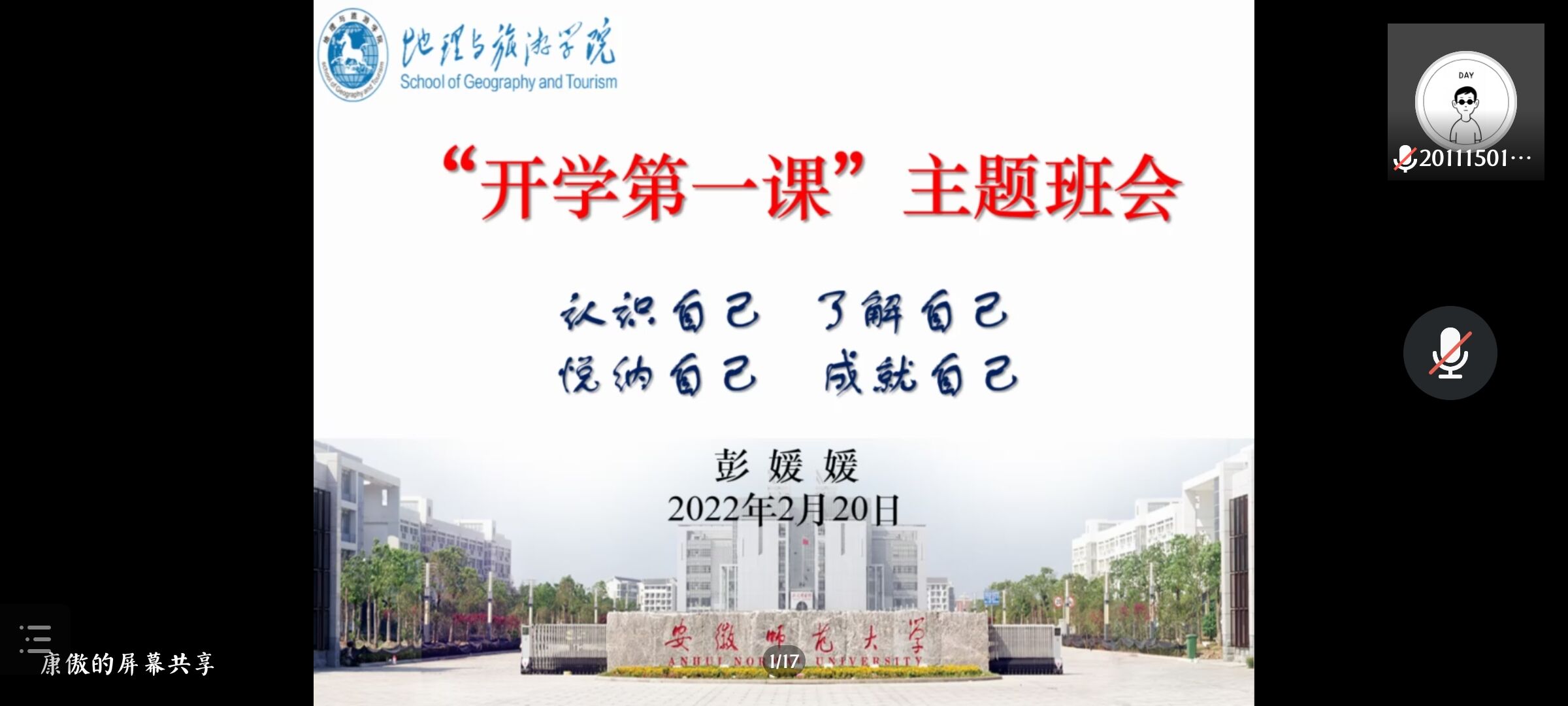 程灵箫 彭媛媛)新学期,新气象。2022年2月20日下午,18地信、20地理类各专业在学院实验楼101报告厅召开了“开学第一课”主题班会,会议由辅导员彭媛媛主持。根据疫情防控要求,本次会议采取线上线下相结合的方式,2018级地理信息科学专业、2020级地理科学(拔尖人才班)、地理科学(师范)1班、地理科学(师范)2班以及地理信息科学专业全体同学参加。