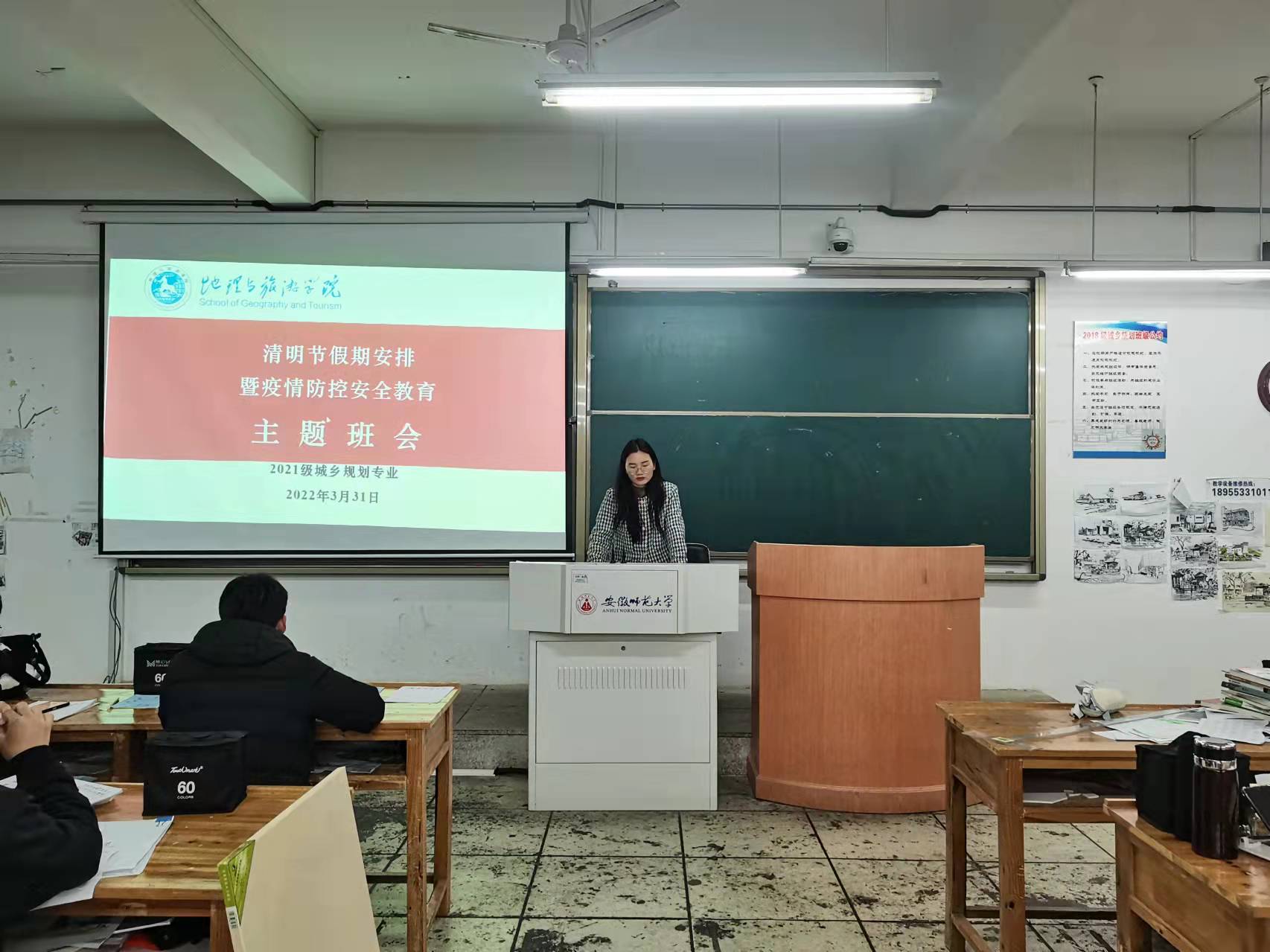 本网讯(韦银艳 张茹平)清明假期即将到来,鉴于当前疫情严峻复杂形势和学生安全教育管理需要,3月31日晚,2021级城乡规划、旅游管理专业分别在固定自习教室召开了清明节假期安排暨疫情防控安全教育主题班会。班会由辅导员韦银艳主持。