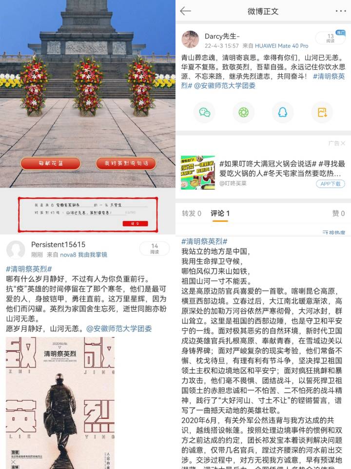 活动结束后,同学们还在微博等线上平台“清明祭英烈”专栏发表了自己对英烈的追思,并纷纷表示,作为一名共青团员定会以积极拼搏的心态,用实际行动庆祝建团100周年,为实现中华民族伟大复兴中国梦凝聚精神力量。