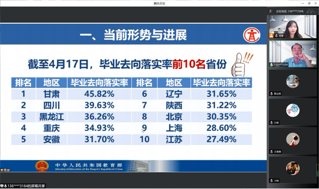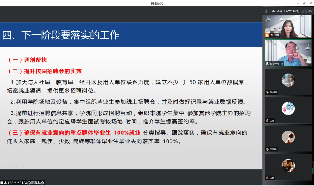 会上,乔静传达了教育部就业调度会议(第三次)精神与学校就业调度会议(第一次)精神,详细介绍了学校学院3月17日以来组织的线上招聘会与成效,具体分析了学院目前的就业形势、存在的困难问题,并明确了下一阶段围绕提高毕业生去向落实率要落实的重点工作。乔静要求帮扶教师,要关心关怀毕业生学习生活和思想心理,发挥就业育人作用,提高人才培养质量,扎实深入帮扶毕业生解决就业难题,为学生顺利落实毕业去向做出积极贡献。