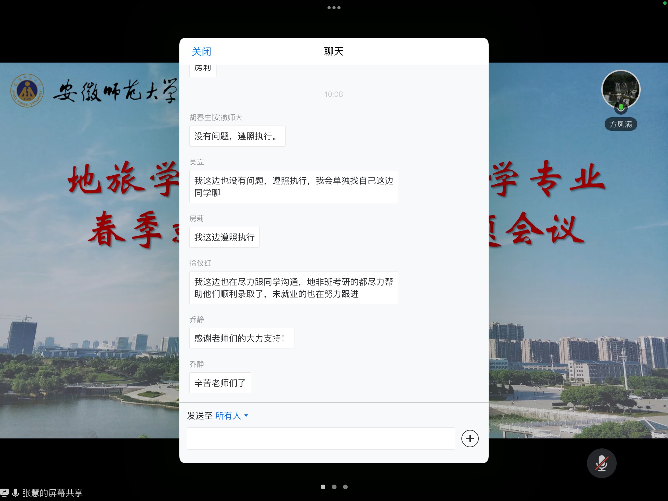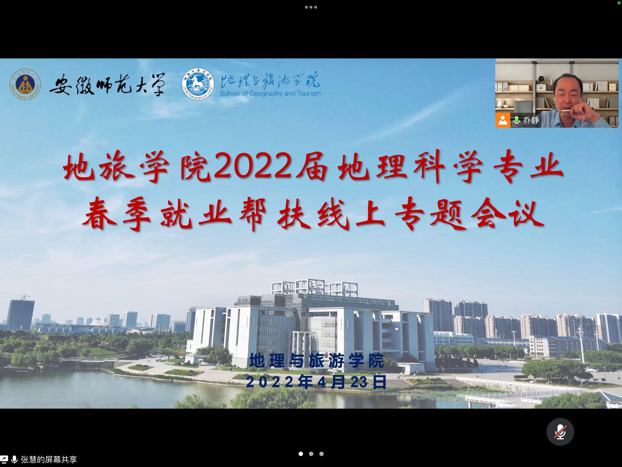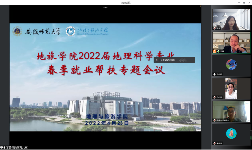 丁茹栩)为进一步高效推进地理专业毕业生就业工作,结合疫情常态化下的就业新形势和学生新需求,2022届地理科学专业于4月23日上午9点在腾讯会议开展线上春季就业帮扶专题会议,院长方凤满、院党委副书记乔静、副院长汪文文、地理专业负责人朱永恒、地理系专业教师、辅导员丁茹栩、张慧出席本次会议。会议由地理专业负责人朱永恒主持。