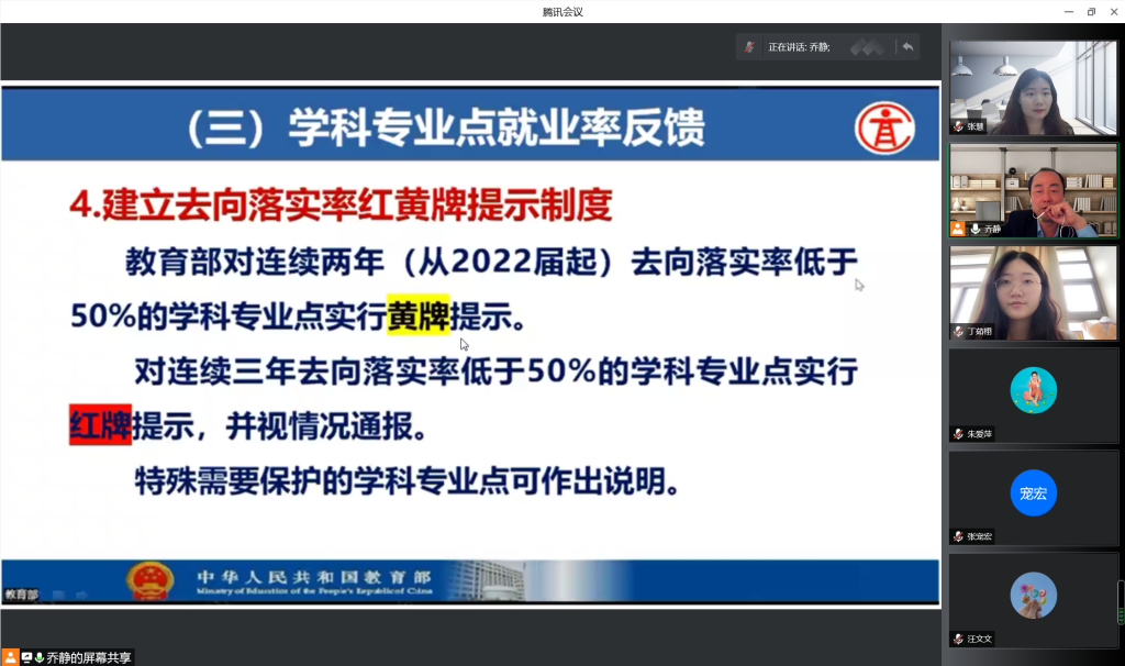 会议伊始,乔静先向列席会议的领导老师传达了教育部就业调度会议(第三次)精神,主要阐述了当前形势与进展、几项重点工作、就业促进周安排和百日冲刺系列活动四个部分。乔静指出,在当前严峻复杂的形势下,就业工作困难程度有所提升,要狠抓工作落实、加快工作进度。随后介绍了目前教育部几项重点工作,例如:国家24365大学生就业服务平台的用实用细、开展“宏志助航计划”培训等。并详细阐述了2022年就业促进周工作安排、“百日冲刺”计划等,提出要严格执行就业“四不准“规定,严禁就业注水。