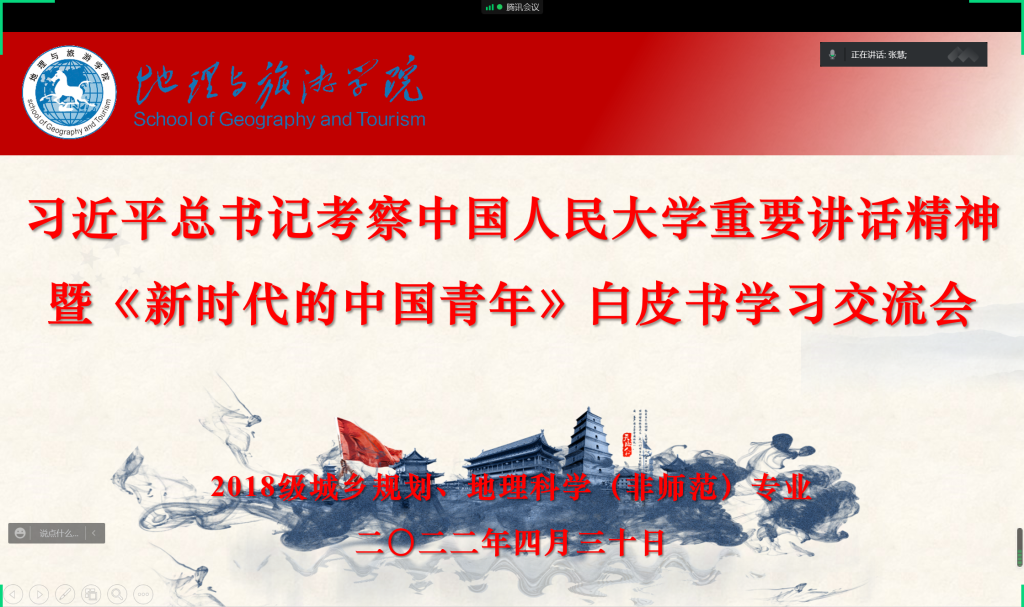 430日,张慧领学了习近平总书记考察中国人民大学重要讲话精神及《新时代的中国青年》白皮书的部分内容,并分享了相关报道视频。2018级城乡规划和地理科学(非师范)专业全体学生认真学习,并展开小范围讨论交流。