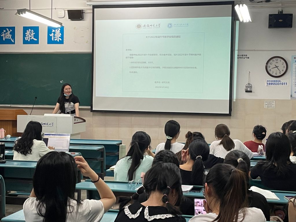会议伊始,韦银艳导员首先向大家介绍了端午节假期调休情况,并倡议大家在端午节期间也要注意疫情防控,做到“非必须不出校”,校外出行要做好疫情防护和交通安全。