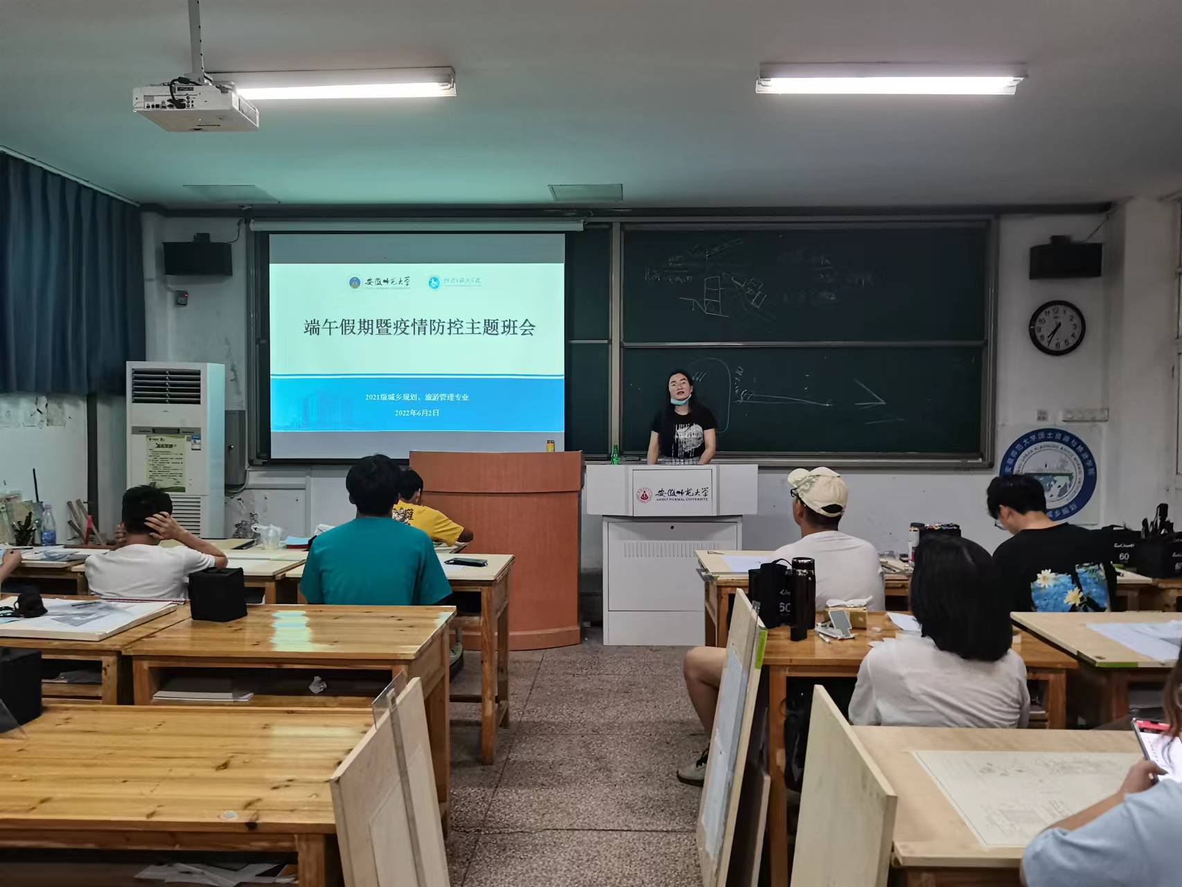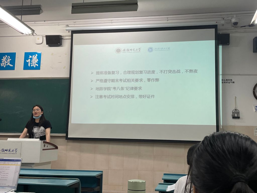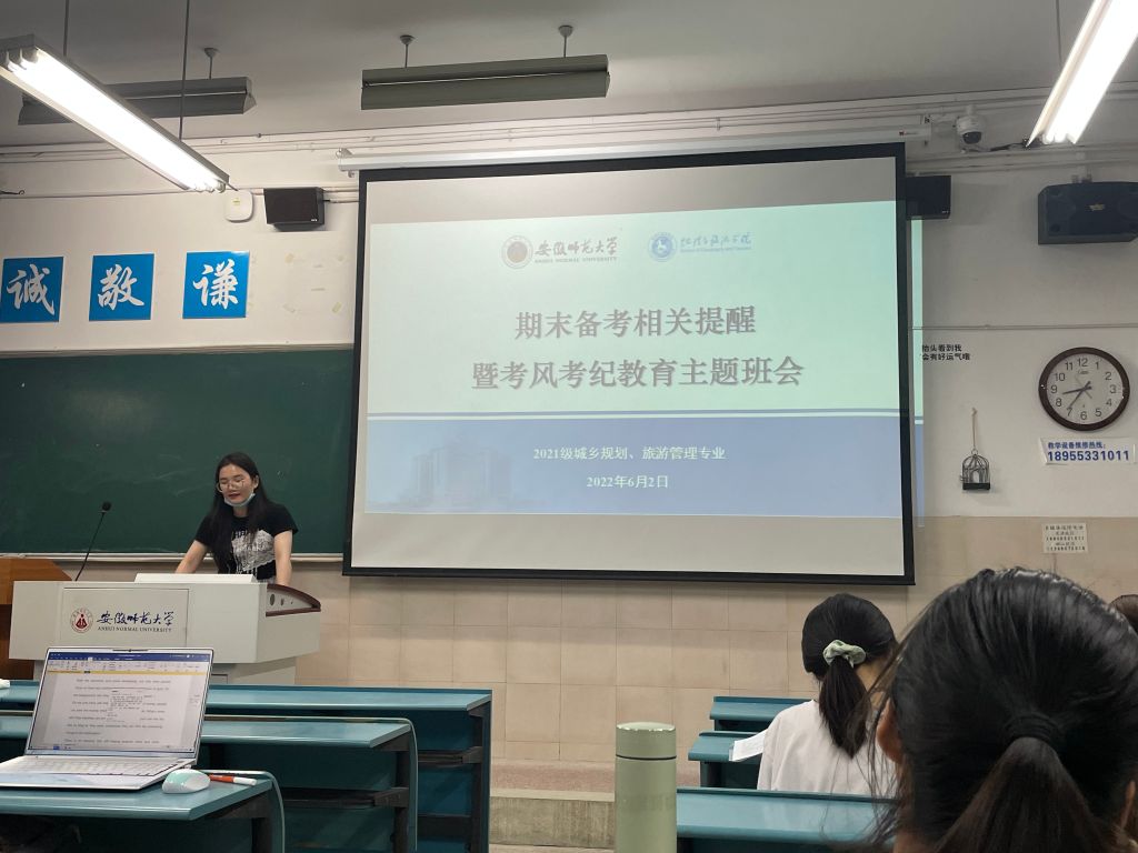 端午假期即将到来,鉴于当前疫情严峻复杂形势和学生安全教育管理需要,6月2日晚,2021级城乡规划、旅游管理专业在固定自习教室召开了端午节假期安排、贫困生认定、期末考试诚信教育暨疫情防控主题班会。班会由辅导员韦银艳主持。