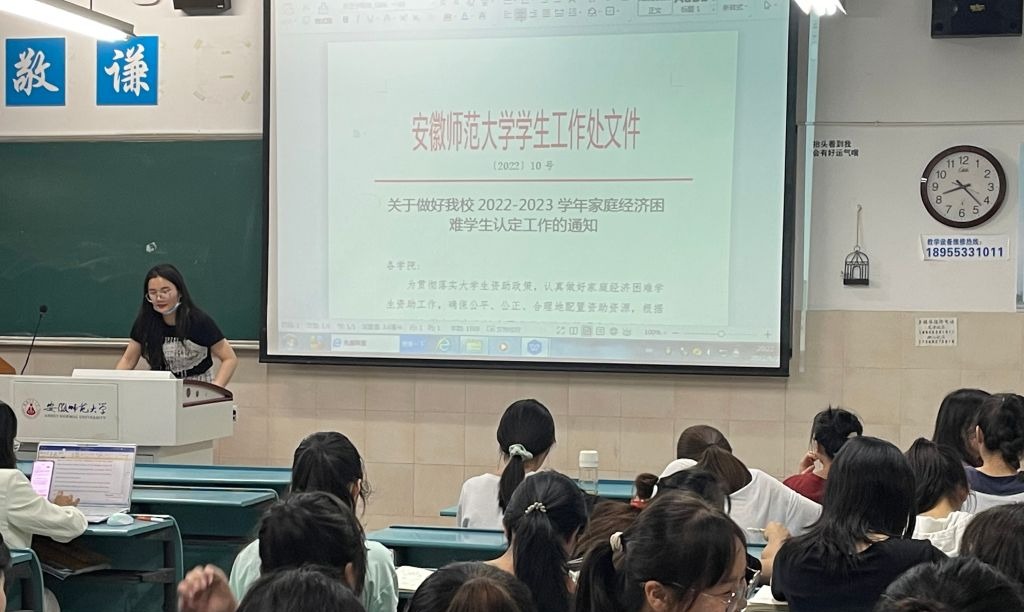 其次,韦银艳对2022-2023学年家庭经济困难学生认定工作进行政策解读和相关提醒,确保每位同学能够确切的了解清楚贫困生认定的步骤以及评议程序。接着,韦银艳对2022-2023学年第一学期二、三轮、重修选课进行提醒,并建议同学们在人才培养方案的指导下,结合自身兴趣和学习能力合理选择相关课程。