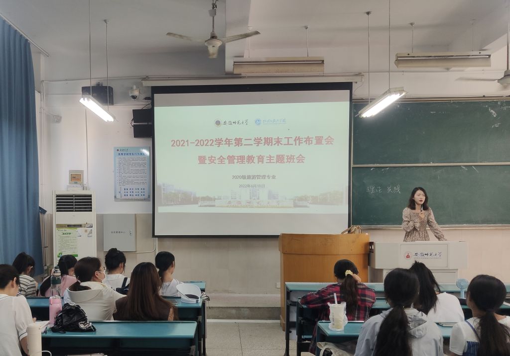 舒玉茹)期末考试临近,为帮助同学们以更佳的状态复习迎考,在营造班级良好备考氛围的同时,加强期末安全教育,增强学生安全防范意识。2022年6月10日下午。2020级旅游管理召开2021-2022第二学期末工作布置会暨安全教育主题班会。此次班会由辅导员赵佳慧主持召开,2020级旅游管理全体同学参加。