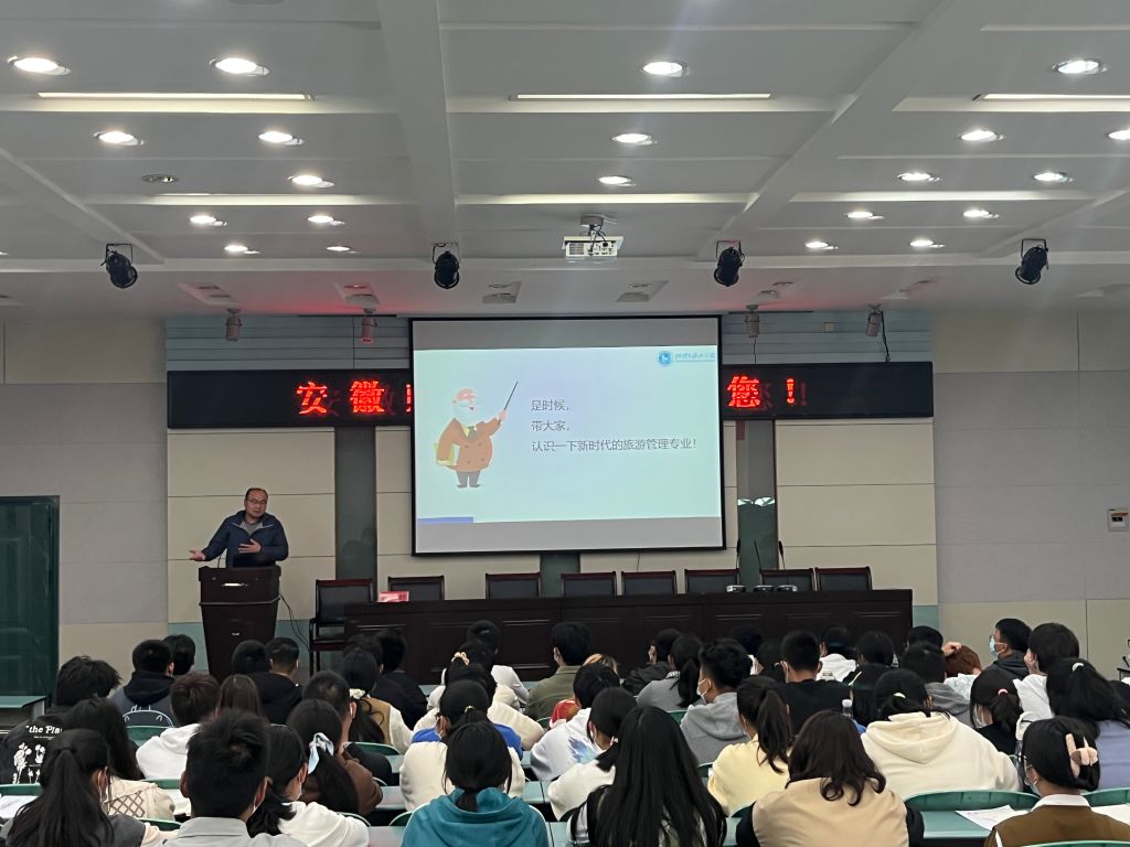 会议由旅游管理专业宣传片拉开帷幕。而后,杨钊教授结合自身实践经历从专业优势、专业历史与建设、专业风采三个方面向同学们展示了我校旅游管理专业的强大实力,并详细讲解了“双师型培养”、“政校企合作”、“本科生导师制度”等六大人才培养方法,为同学们指点迷津。