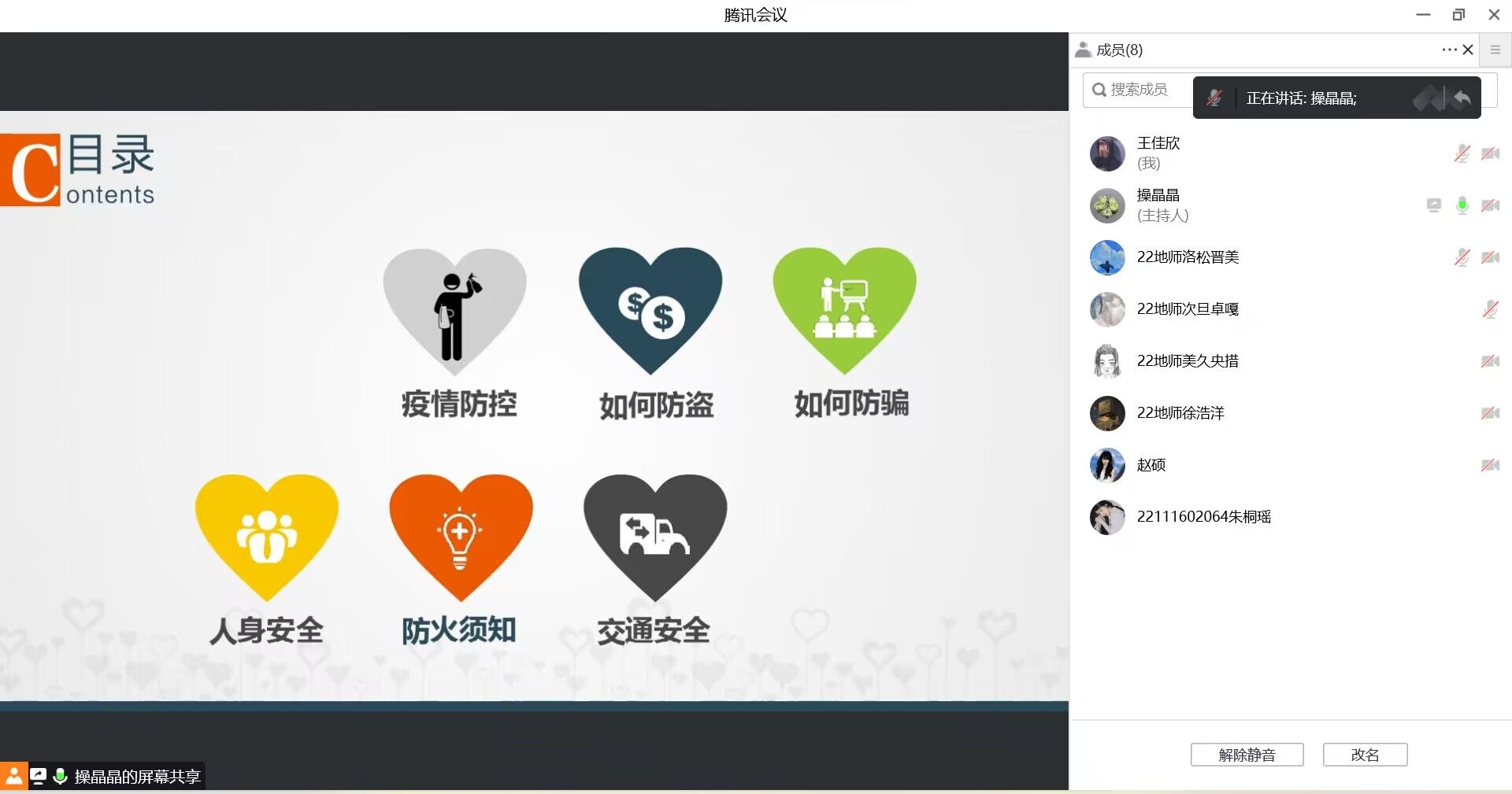 此次班会主要从“校园安全知多少”和“大学——梦开始的地方”两部分开展。会上,操晶晶针对疫情防控、如何防骗、防火须知、交通安全、人身安全、如何防骗六个方面为同学们详细讲解了身边常见的安全类型和注意事项,结合校纪校规的要求着重强调了秋冬季节的防火问题,杜绝违规电器的使用,筑牢安全底线。此外,针对同学们当下的学习状态,操晶晶要求同学们端正学习态度、树立正确的学习目标、培养良好的学习习惯,争做新时代德智体美劳全面发展的青年大学生。