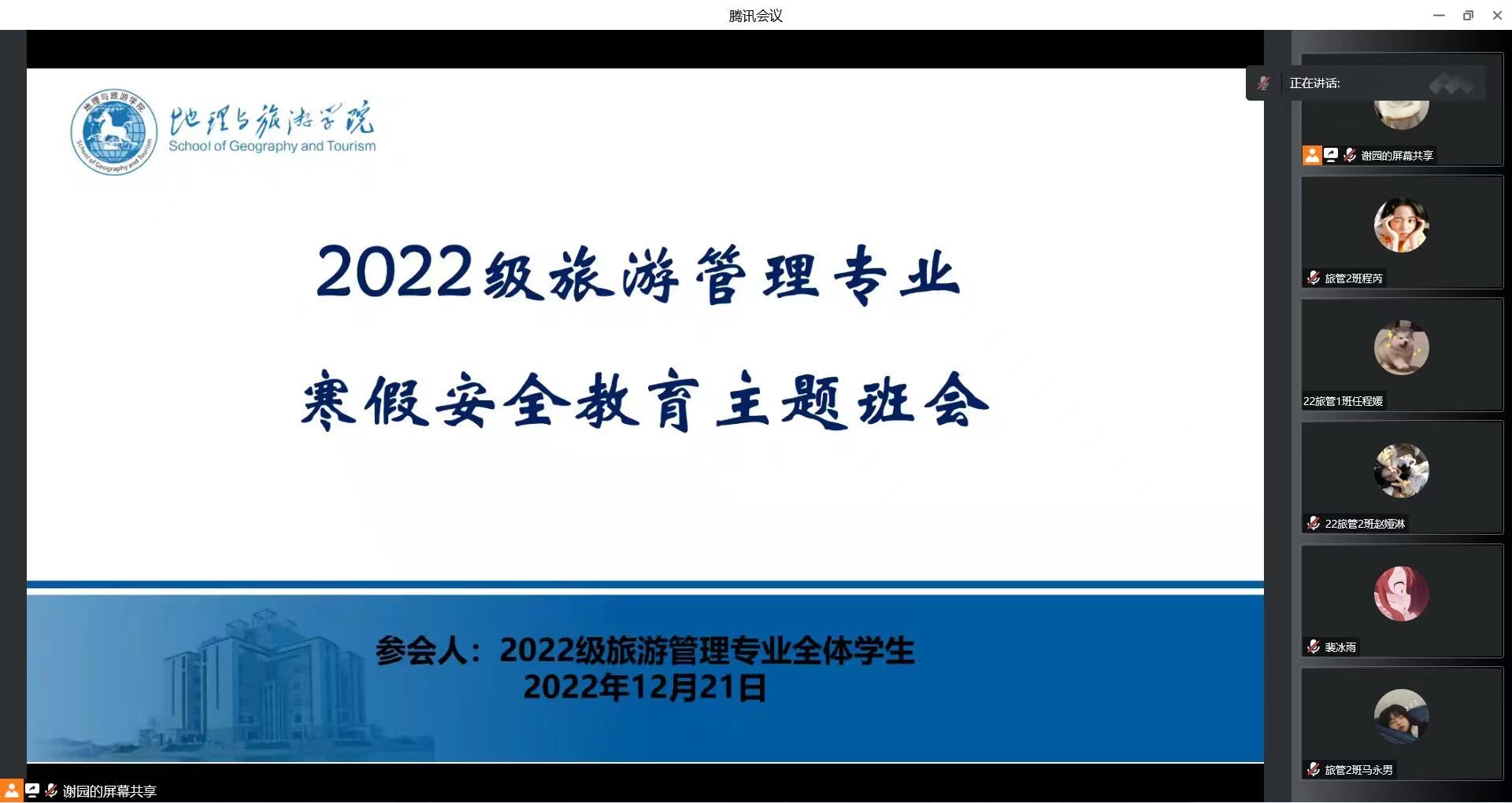 为提高同学们的安全意识,帮助同学们度过一个平安充实快乐的寒假,12月21日下午两点,2022级旅游管理专业线上举行寒假安全教育主题班会。2022级旅游管理专业全体同学参加班会。班会由辅导员谢园主持。