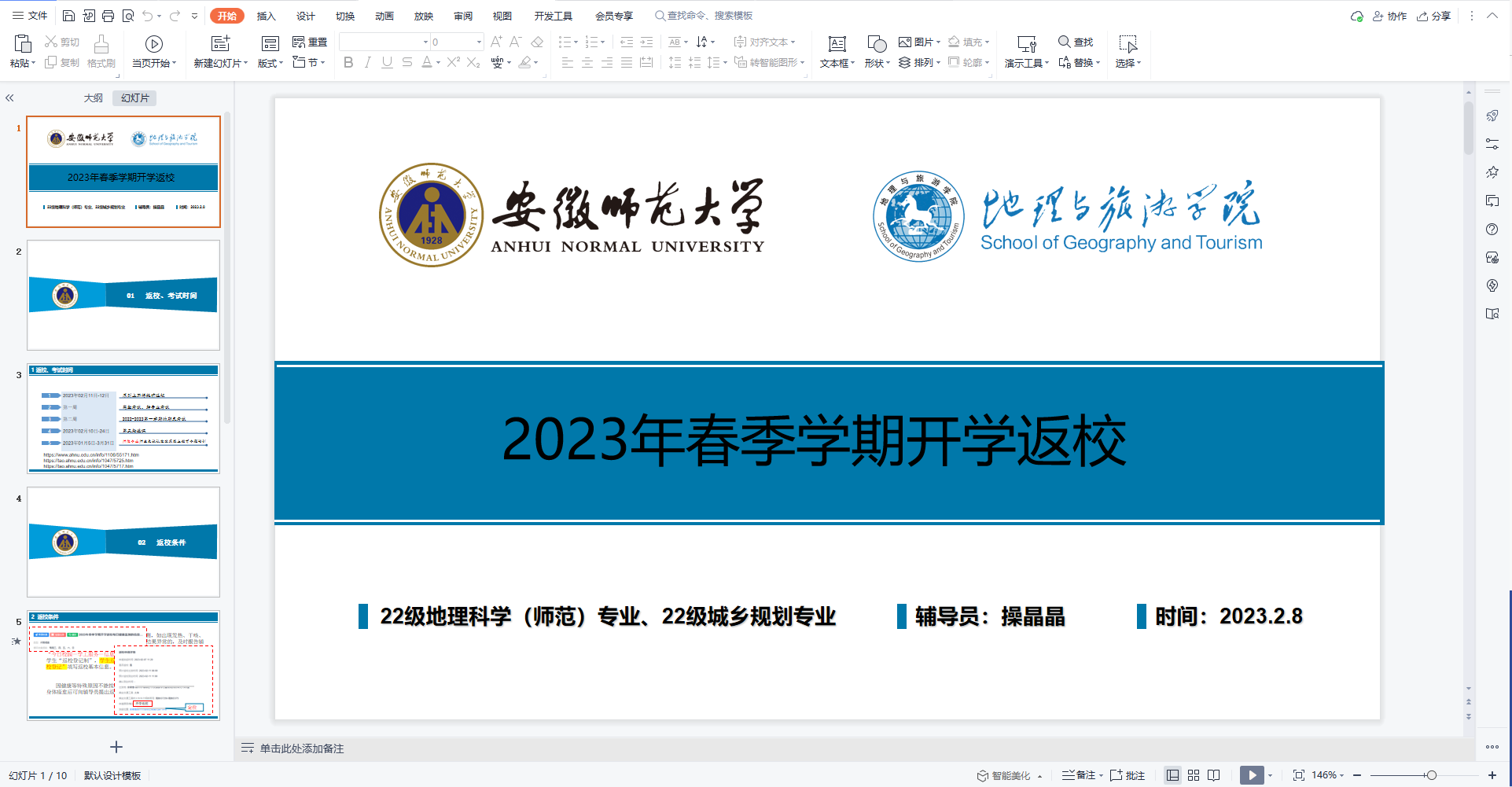 为布置落实2023年春季学期学生开学返校的工作事宜,确保学生安全顺利返校,2月8日上午,辅导员操晶晶组织召开春季学期开学返校主题班会,22级城乡规划、地理科学(师范)专业学生参加。