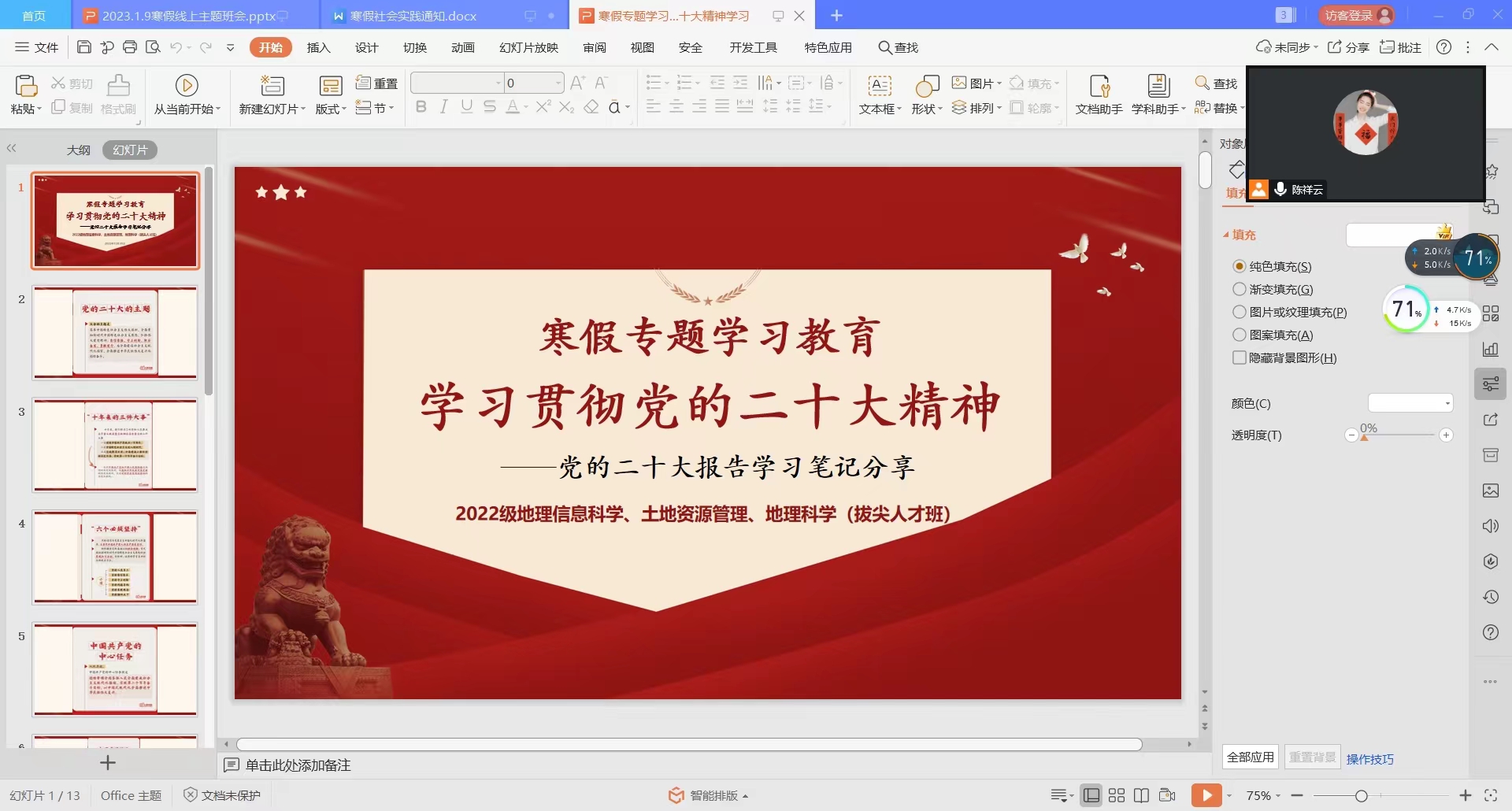 本网讯(顾冉 陈祥云)近日,2022级地理信息科学、土地资源管理、地理科学(拔尖人才班)专业开展学习宣传贯彻党的二十大精神专题学习线上团日活动。2022级地理信息科学1班、土地资源管理专业1班、地理科学(拔尖人才班)1班团支部全体同学线上参加,会议由辅导员陈祥云主持。