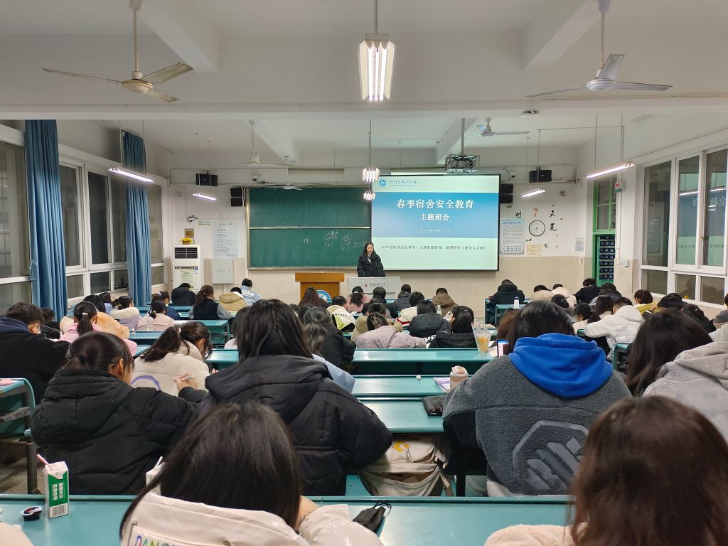 魏语菲、陈祥云)2月13日晚,2022级地理信息科学、地理科学(拔尖人才班)、土地资源管理分别于教学楼4号楼201、202、302教室举行2022-2023学年春季学期首次线下主题班会暨寝室安全专题教育,全体同学参与此次会议,会议由辅导员陈祥云主持。