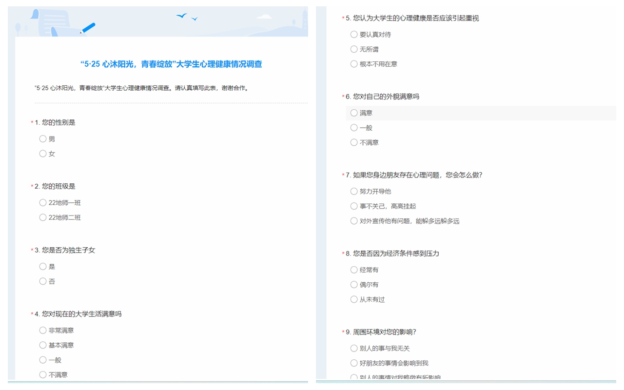 “心沐阳光·青春绽放”大学生心理健康问卷调查报告。通过问卷调查了解学生对大学生活的适应、学业规划、人际相处等问题,针对这些问题作出了分析。