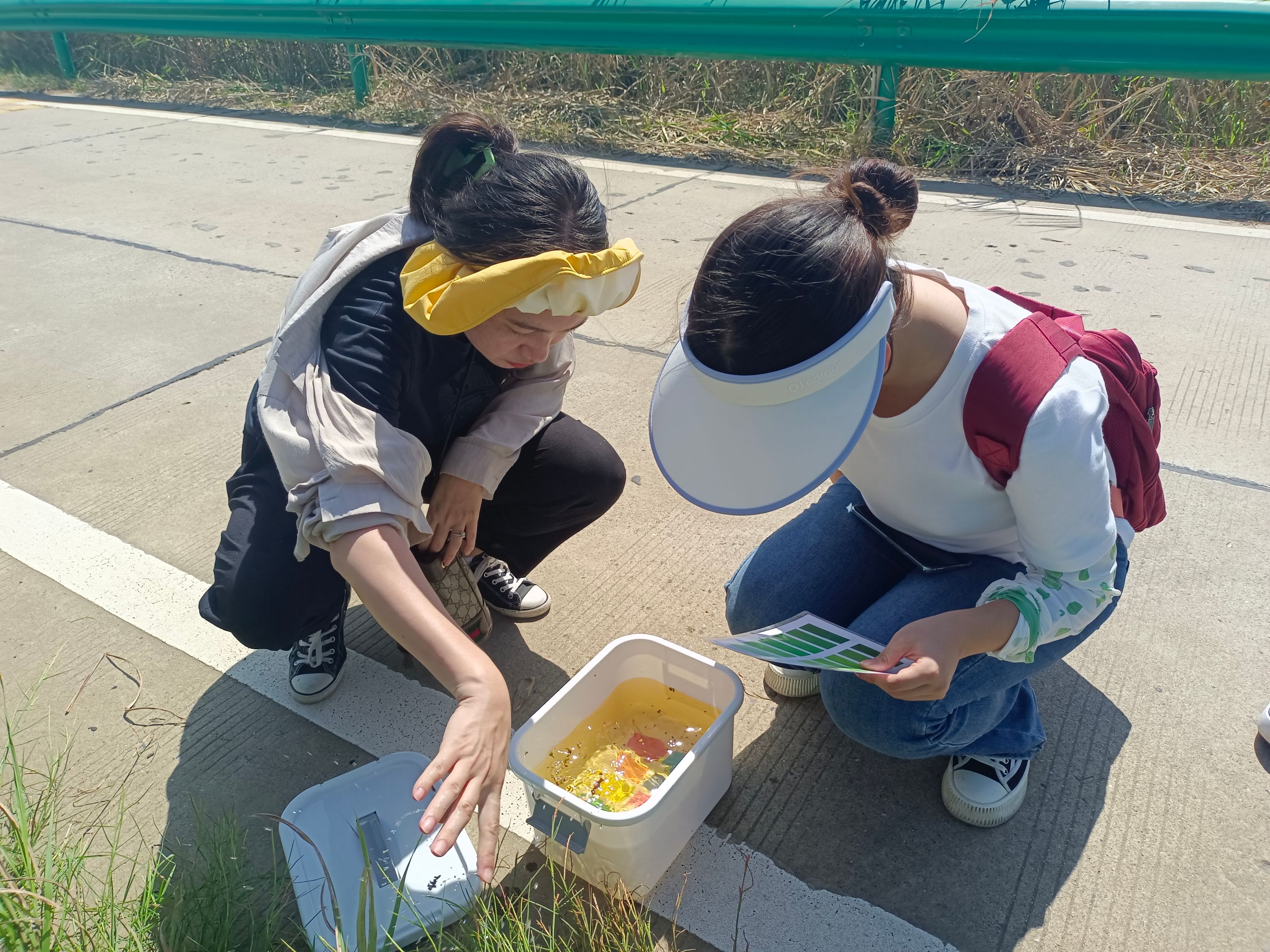 在老师的指导下,成员们进行了水样的采集并记录了经纬度,然后与色卡进行对照与判断。