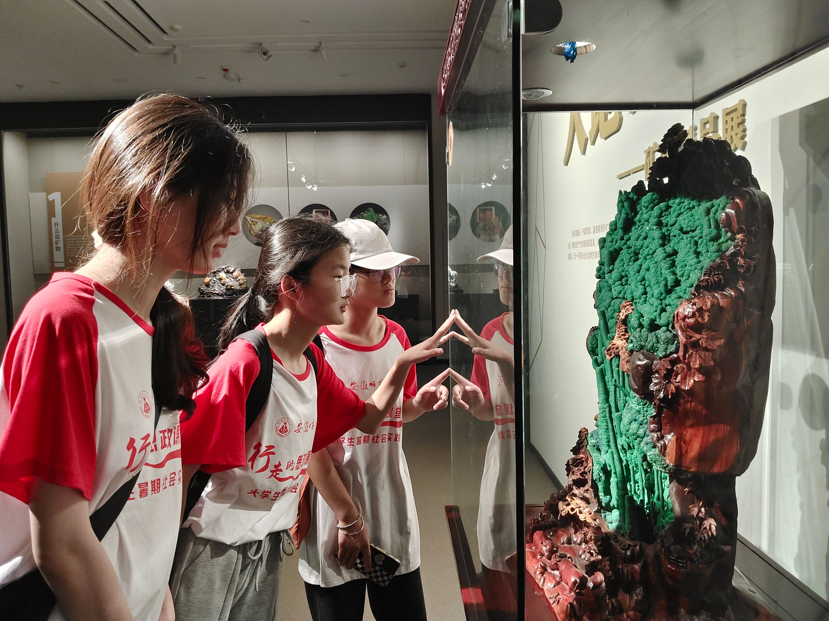 步入古铜矿博物馆大厅,一幅描绘铜绿山青铜脉络的铜雕长卷徐徐展开,“从青铜故里,到南铜北运,铜助楚兴,大冶的青铜曾经兴盛起长达八百年之久的古楚国。”在讲解员的引导下,我们步入铜山有宝展厅,琳琅满目的矿石雕刻巧夺天工,十二生肖的孔雀石兽首活灵活现,青山碧水的铜绿雕刻栩栩如生,独到的呈现手法让队员们重新认识了昔日暗淡的矿石,也启发了新的文创设计灵感。