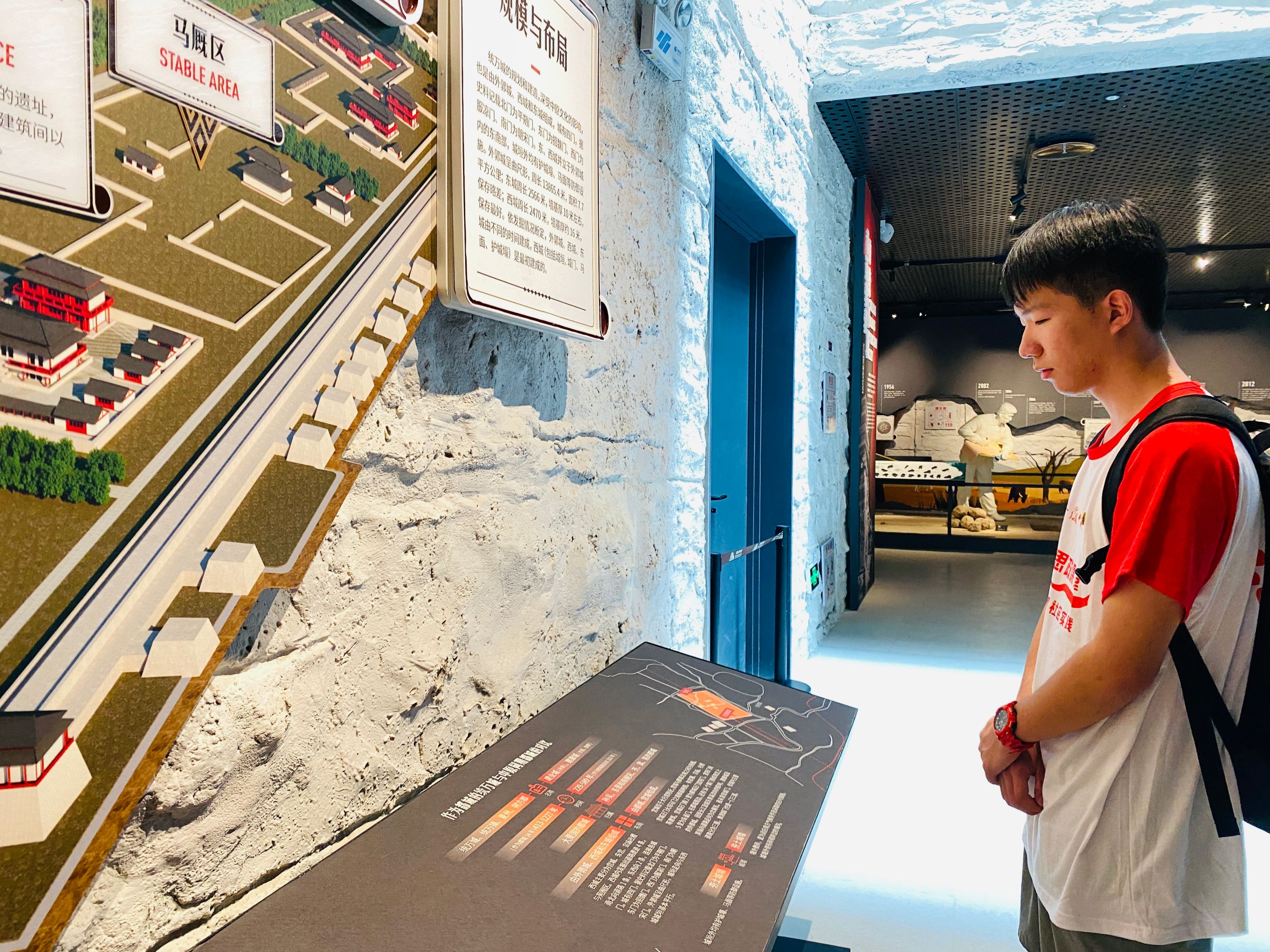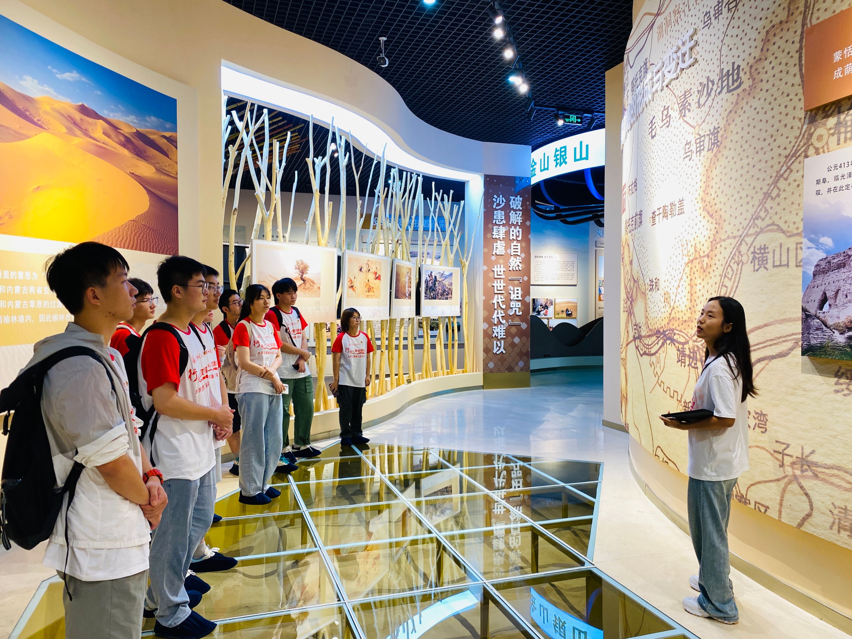 调研首日,实践小队走访牛玉琴治沙基地和见证统万城遗址历史。从“再见了毛乌素”到“再见到毛乌素”,这片荒凉之地世代相传治沙精神——“毛乌素精神”。8月9日上午,团队来到了靖边县治沙教育基地,刚刚踏入展馆,四周就弥漫起了阵阵黄沙,呼啸而过的风声让人感觉如临治沙前的毛乌素沙地一般。跟随讲解员的步伐,了解到曾经的毛乌素沙地曾经的环境非常优美,适宜居住,但随着人类活动不断加剧,当地生态逐渐破坏,沙地面积不断扩大。紧接着,讲解员向团队介绍了牛玉琴的治沙事迹,牛玉琴变卖家当、几经波折,与丈夫儿子共同奋斗,30多年矢志不渝战风沙,实现“人进沙退”的生态逆转。