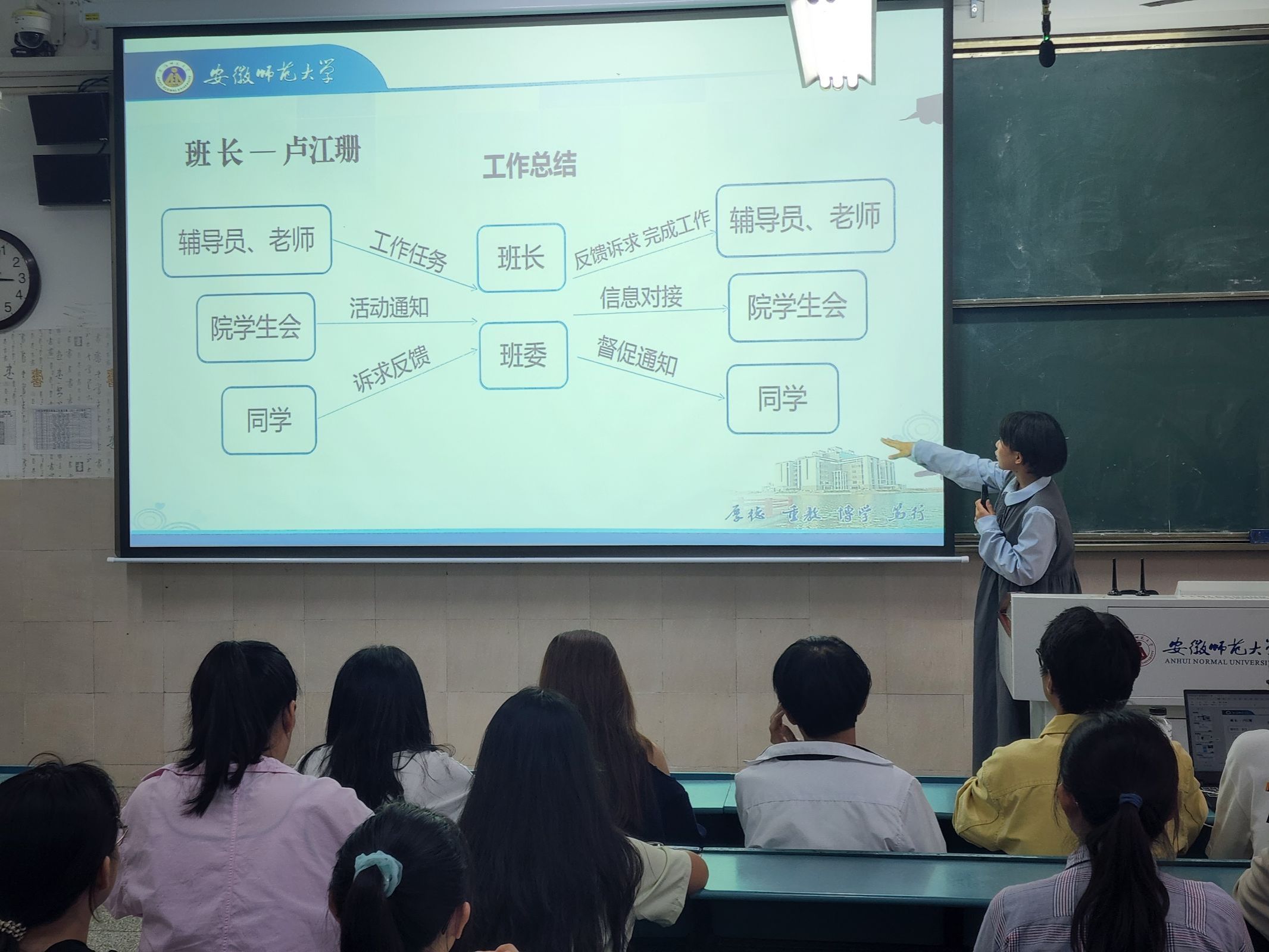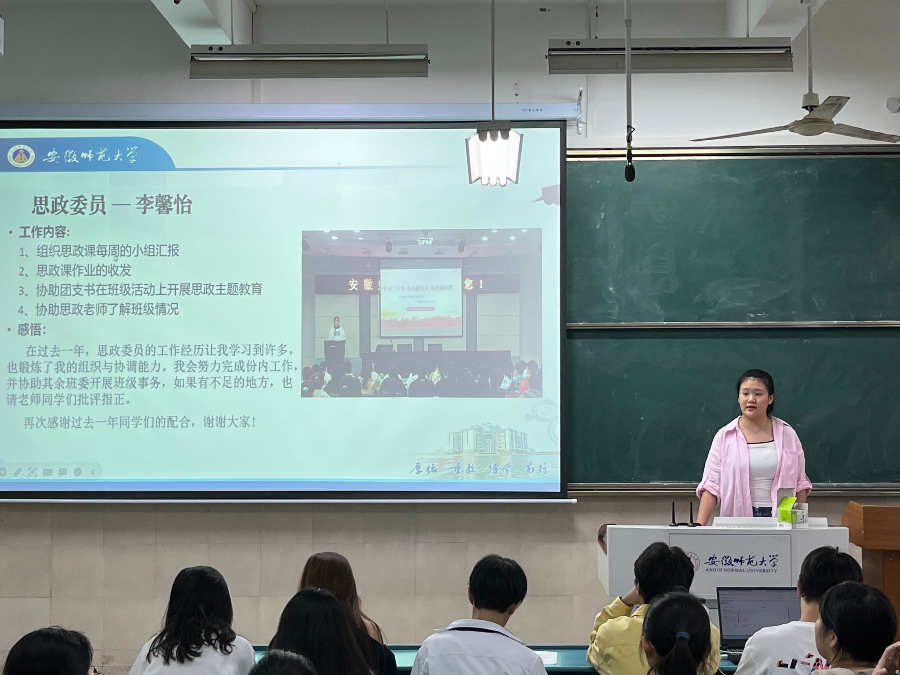 会上,各位班委对过去一年的工作内容、工作成果和心得体会进行分享汇报。2班副班长孙爽说到,“在过去一年里班委的工作让我拥有服务同学们的机会,也很感谢这一年以来各位同学们的支持配合,希望未来能够携手共进,打造一个更加温暖团结积极向上的班集体。”同学们怀着感谢、宽容的态度认真听着班委们的汇报,掌声、笑声不断。