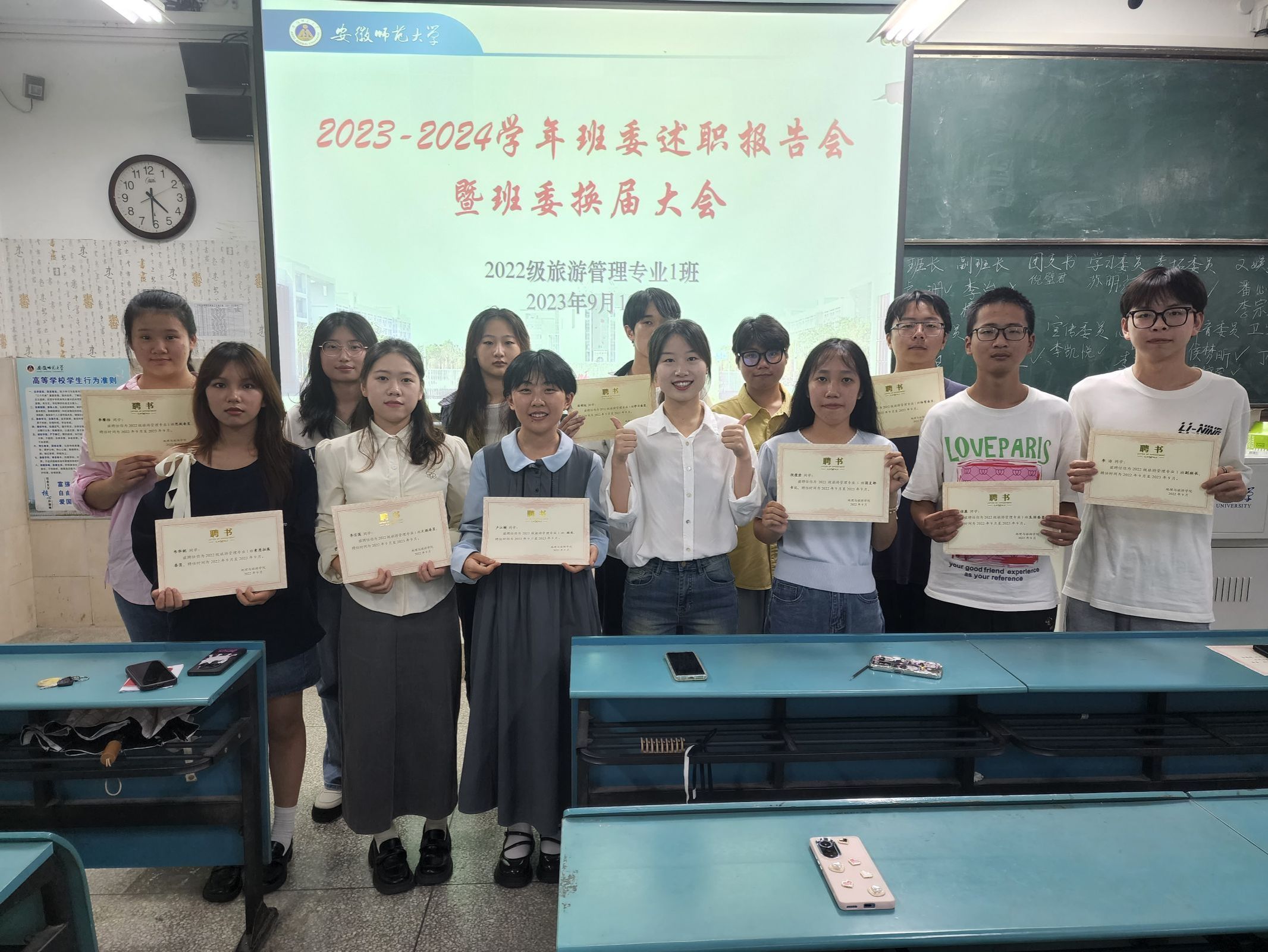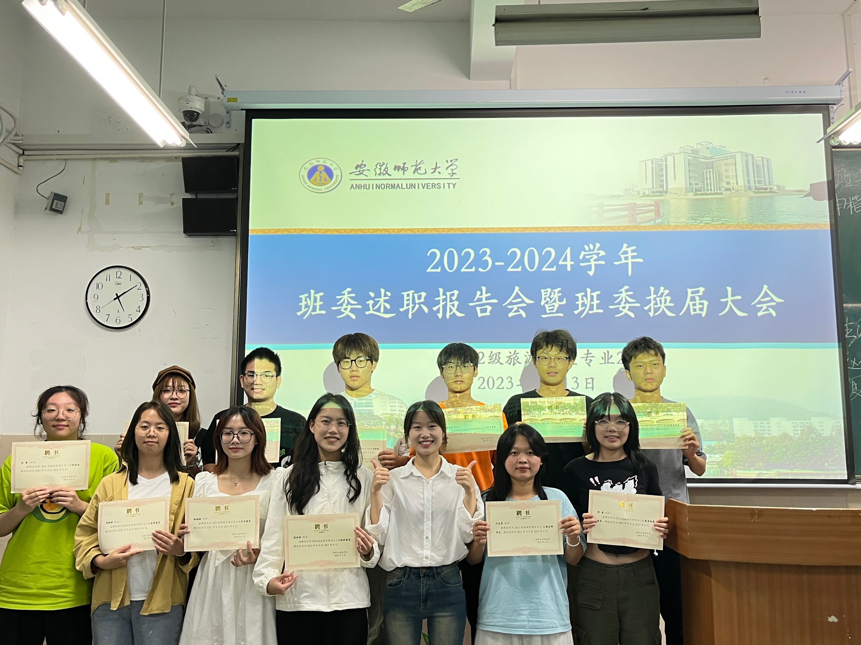 会上,谢园对上一届班委的工作进行了总结。她指出,“上一届班委总体上是认真负责、团结肯干的,希望下一届班委能够接住接力棒,在为同学们服务的过程中增长自身才干,继续发挥先锋模范的作用。”谢园为上一届班委发放了聘书并且合影留念。