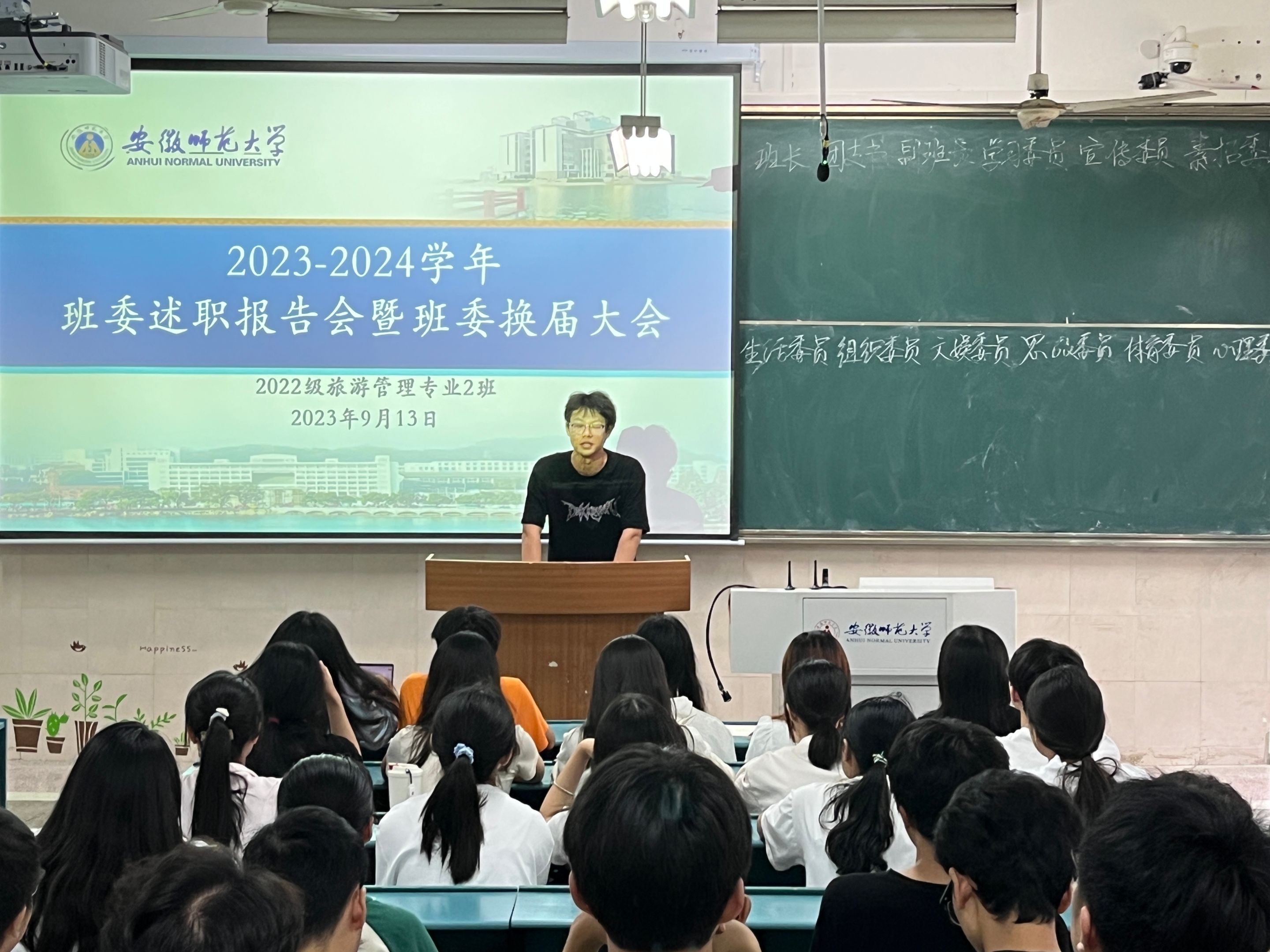 周婷婷)展望未来谱新篇,不忘初心重传承,2023年9月13日下午三点,2022级旅游管理专业2023-2024学年班委述职报告会暨班委换届大会分别于行知楼2040101、2040103教室举行,会议两位班长主持,辅导员谢园和全体同学参加。