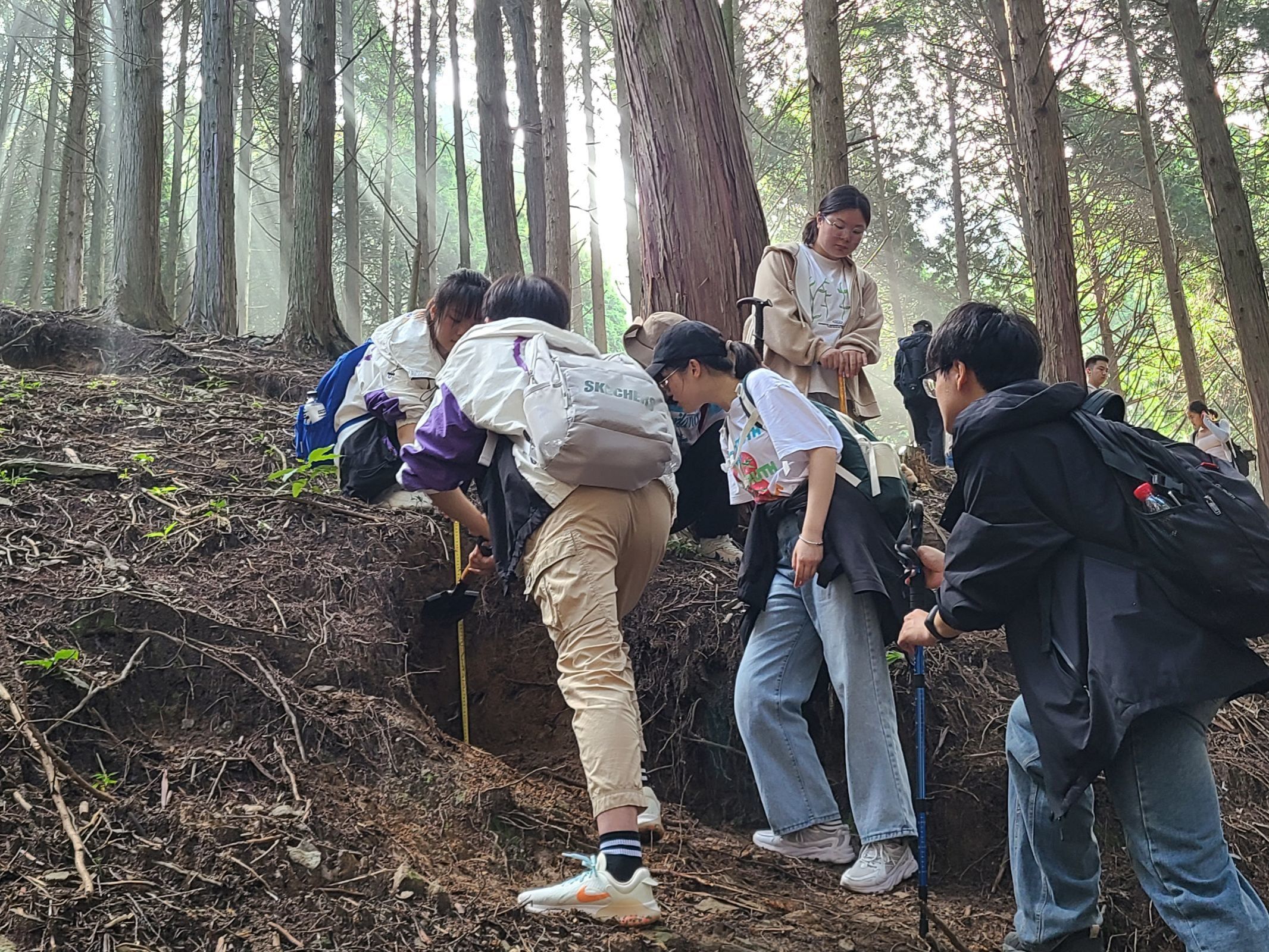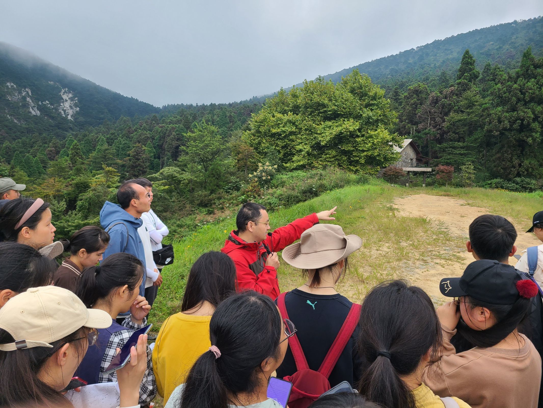 途中,老师们倾囊相授,通过声情并茂的讲解、耐心细致的引导,将课堂理论与野外实践充分结合,既加深感性认知,又促进理性思考。胡春生老师带领同学们逐步观察和认识庐山地区的地质地貌现象,引导分析复杂的地貌过程和变迁历史;徐仪红老师结合气候与植被的相关知识,带领同学们观察、认识不同类型的土壤剖面,分析成土因素和成土过程的差异,总结庐山地区的土壤地带性,并讨论了特殊的小气候现象以及草甸土的特征和成土过程;刘新圣老师鼓励大家调用自己的多重感官,从感性与理性两个方面认知不同的植物,并感受不同气候带下植被群落的变化以及与地理环境的相互关系;朱爱萍老师通过测站数据的对比带领大家充分了解了庐山垂直气候带的变化。