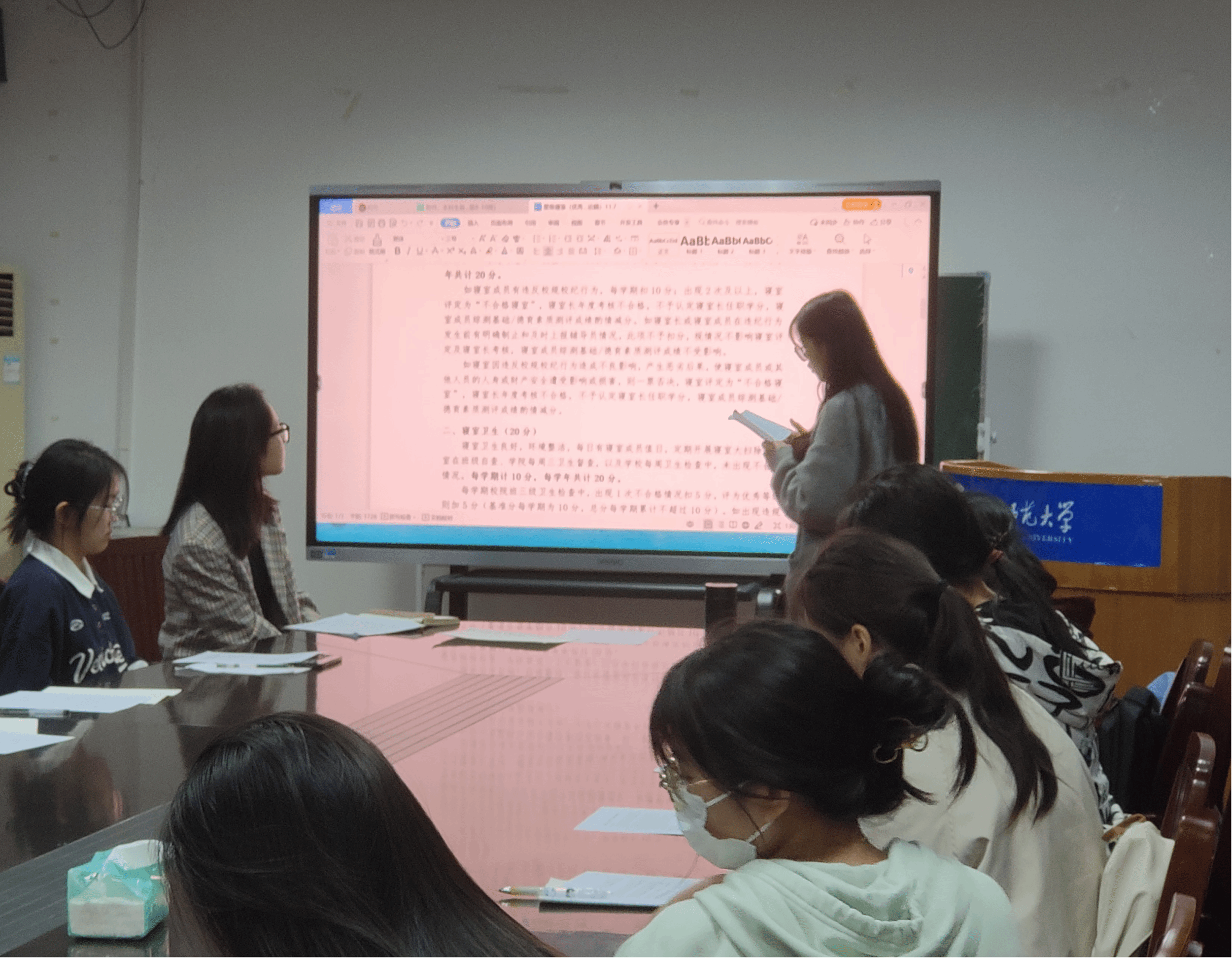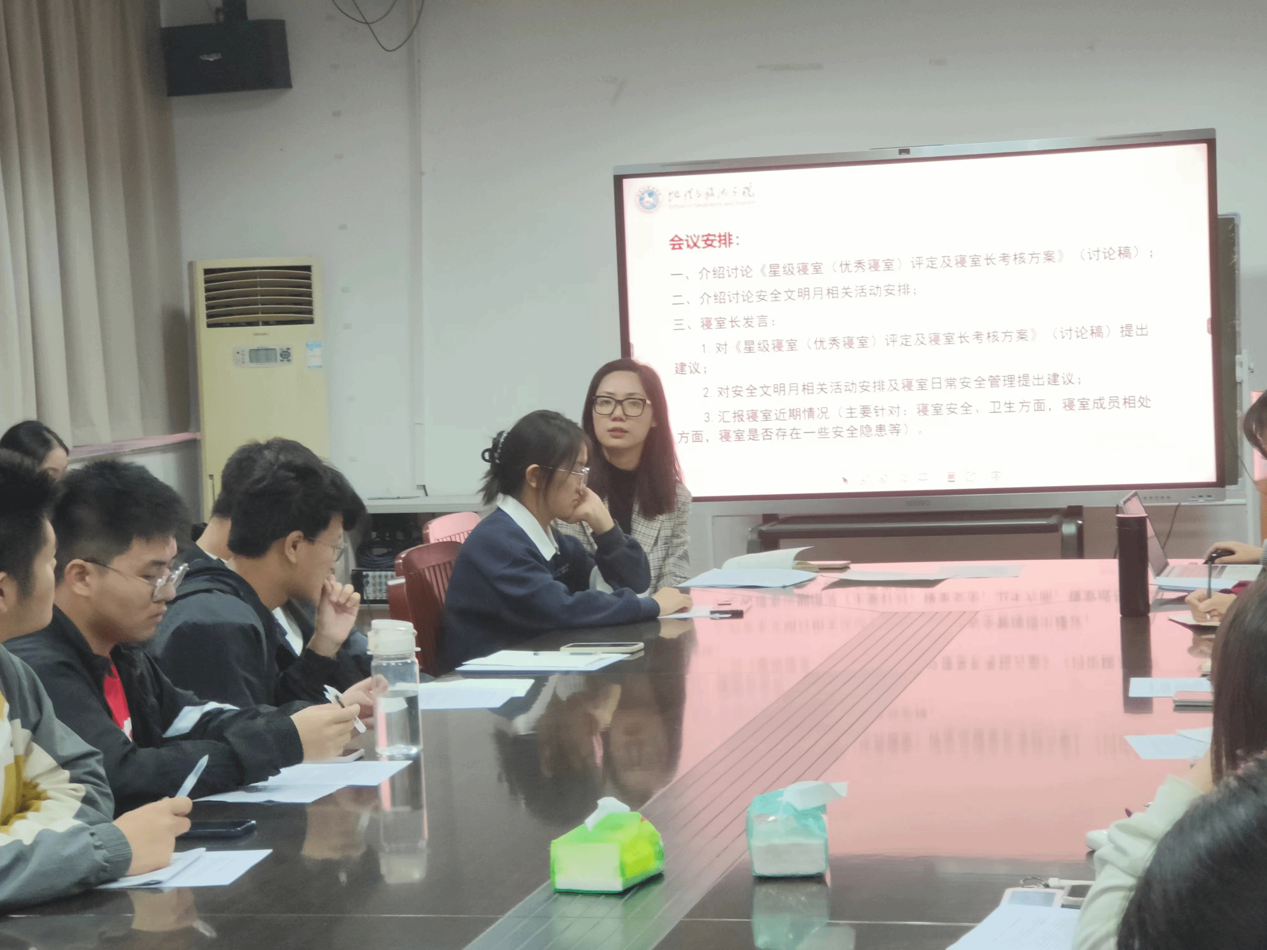 班级生活委员向参与会议的寝室长们介绍《星级寝室(优秀寝室)评定及寝室长考核方案》(讨论稿)并进行条目解读,收集寝室长对其意见与建议。班级安全委员向班级寝室长简要介绍即将开展的安全文明月系列活动,为“1+1+1”即“1场主题班会、1次专题教育活动、1次全覆盖安全用电突击检查”的安全教育月活动安排做好谋划。