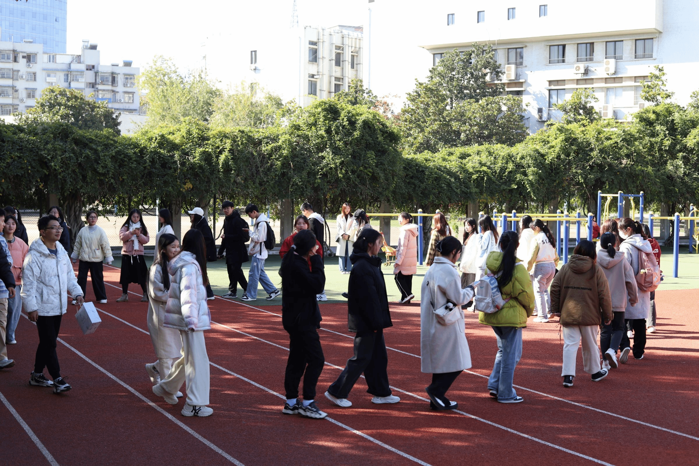 图为陈仁均教授与工作人员们在校园里漫步。周雨婷