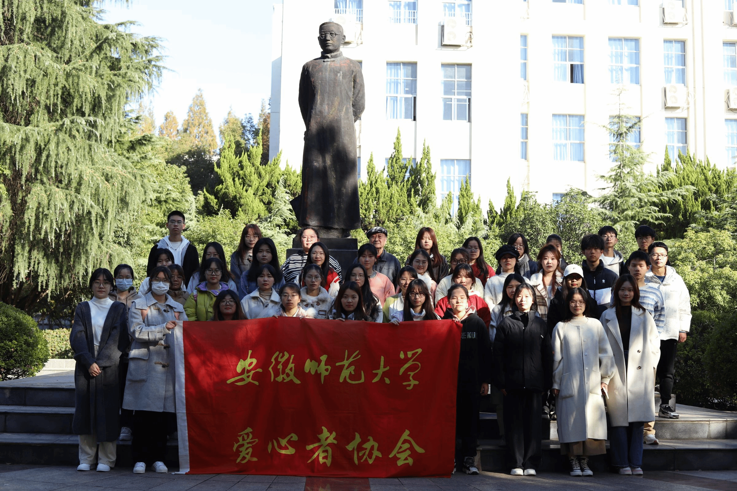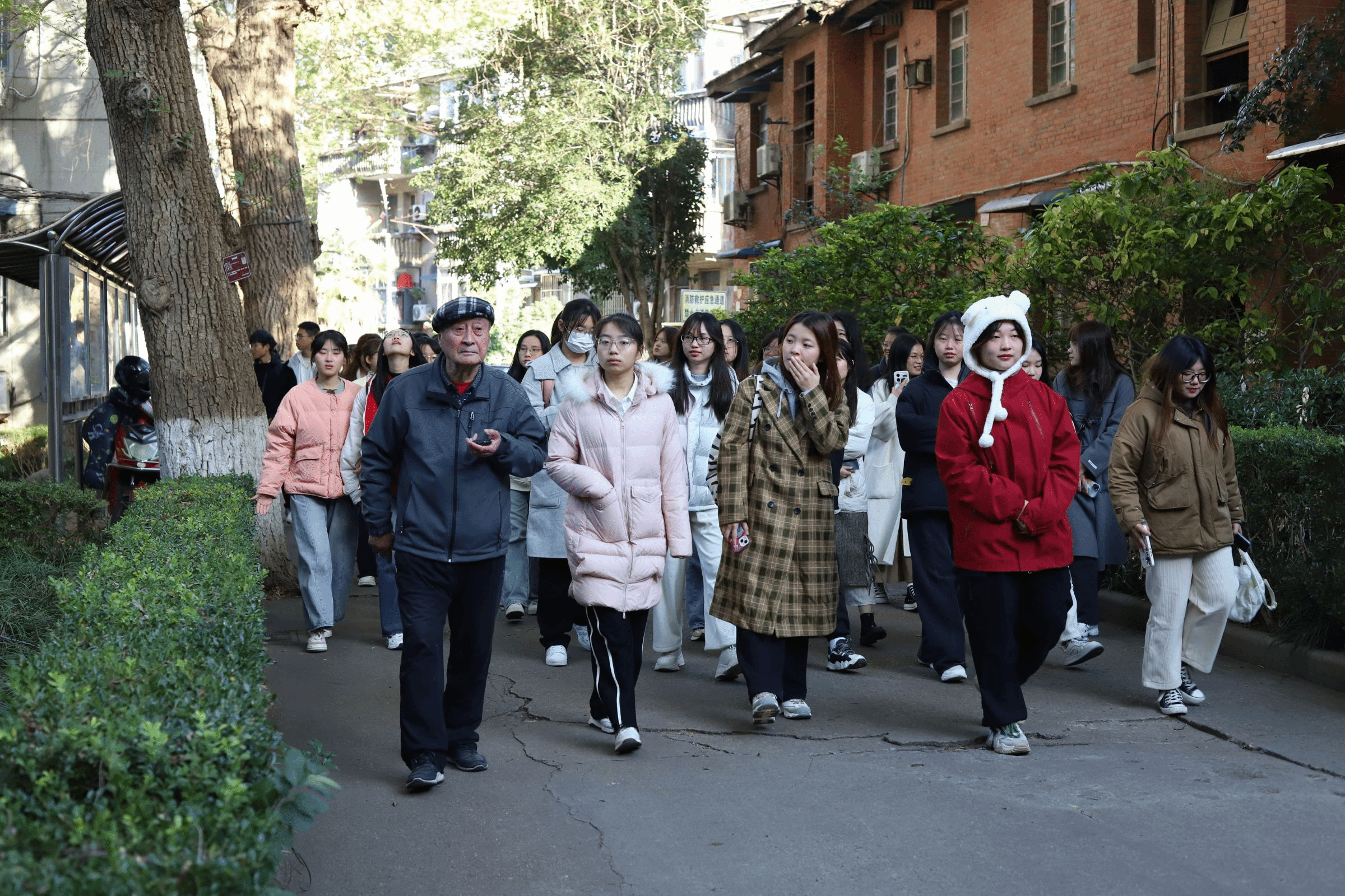 在简单的讲话后,陈仁均老师带领工作人员们参观了赭山校区里的田家炳教育书院、五四学堂和皖江中学堂等极其富有学校历史韵味的胜地,每到一处名迹,陈老师都会耐心地为同学们讲解与其相关的历史。除此之外,陈教授还为同学们介绍了赭山校区的古树名木,参天古树见证着我校的沧桑巨变,也用其挺拔的身姿告诉每一位师大学子,立德树人当不屈不挠。