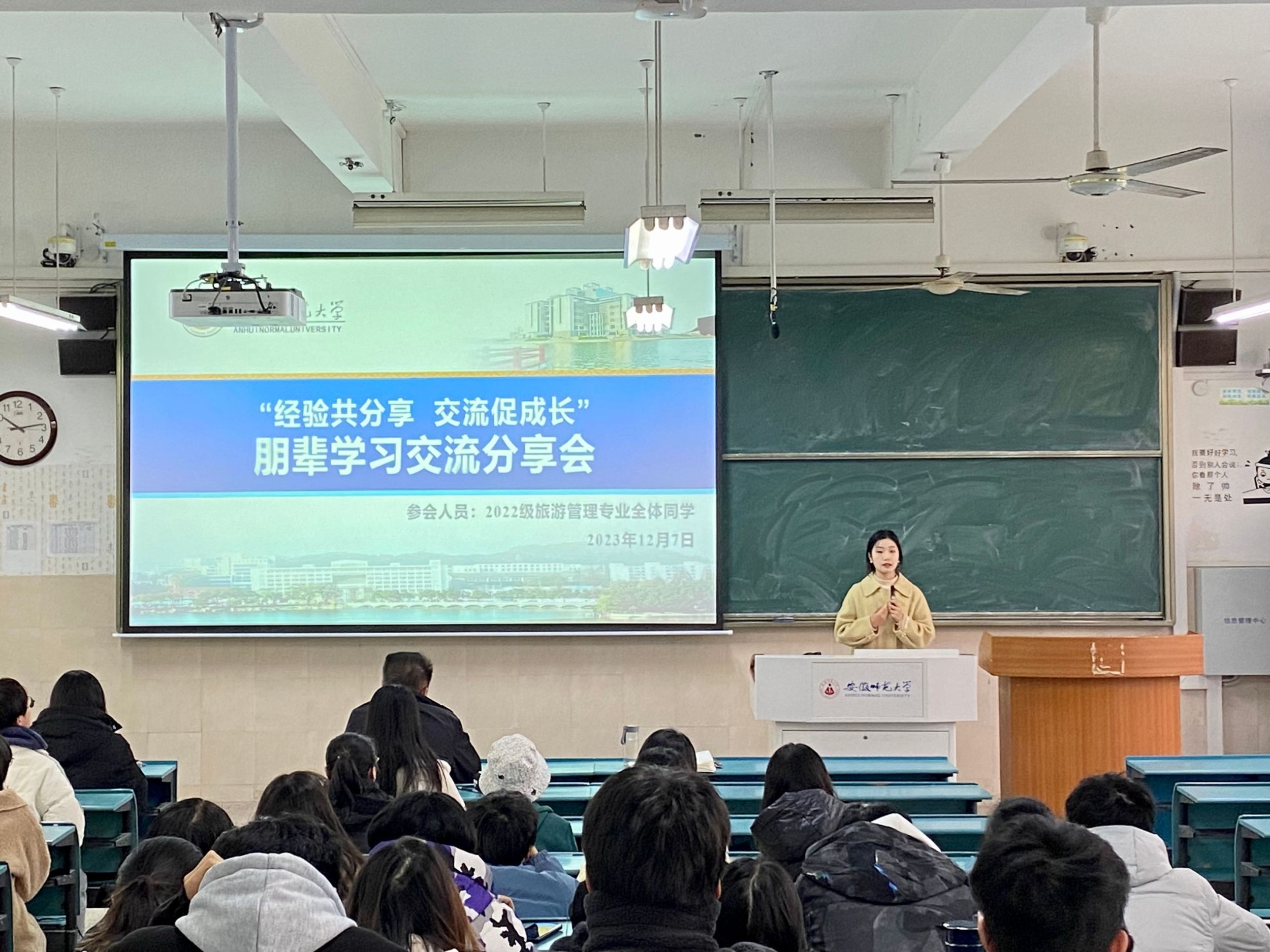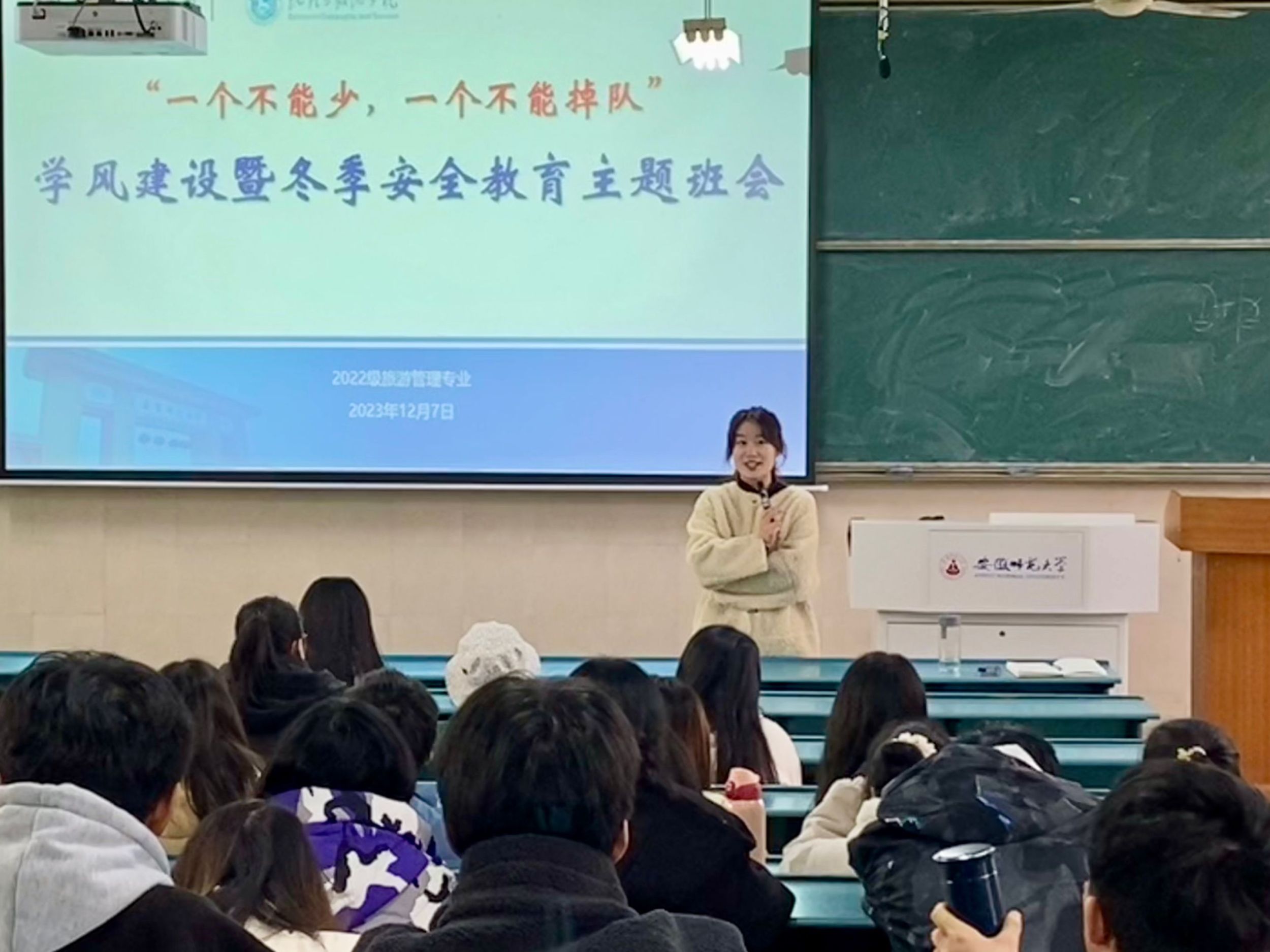 本网讯(李凯悦)12月7日上午,2022级旅游管理专业在行知楼4号楼101教室召开“一个都不能少,一个都不要掉队”学风建设暨冬季安全教育主题班会,会议由辅导员谢园主持,旅游管理专业教师张伟、2020级旅游管理专业的陶栗、徐菁和2022级旅游管理专业全体学生参加。