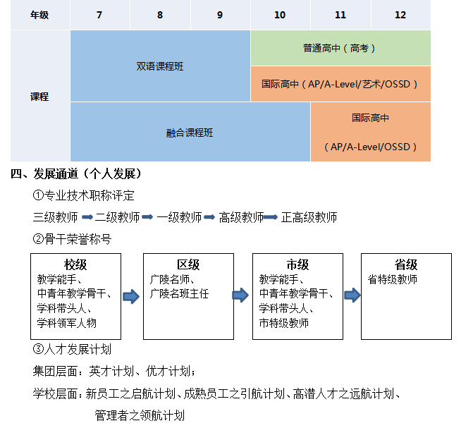 国际高中覆盖10-12年级,共有15个班,350余名学生,包括四种班型:美国方向AP班、英国方向A-Level班、艺术留学班,以及加拿大方向OSSD班(高三开设)