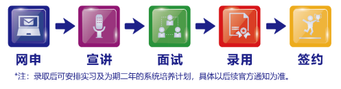 网申—校园宣讲—面试—发放录取通知(注:录取后将进行实习安排和为期二年的培养计划,具体以后续通知为准。)